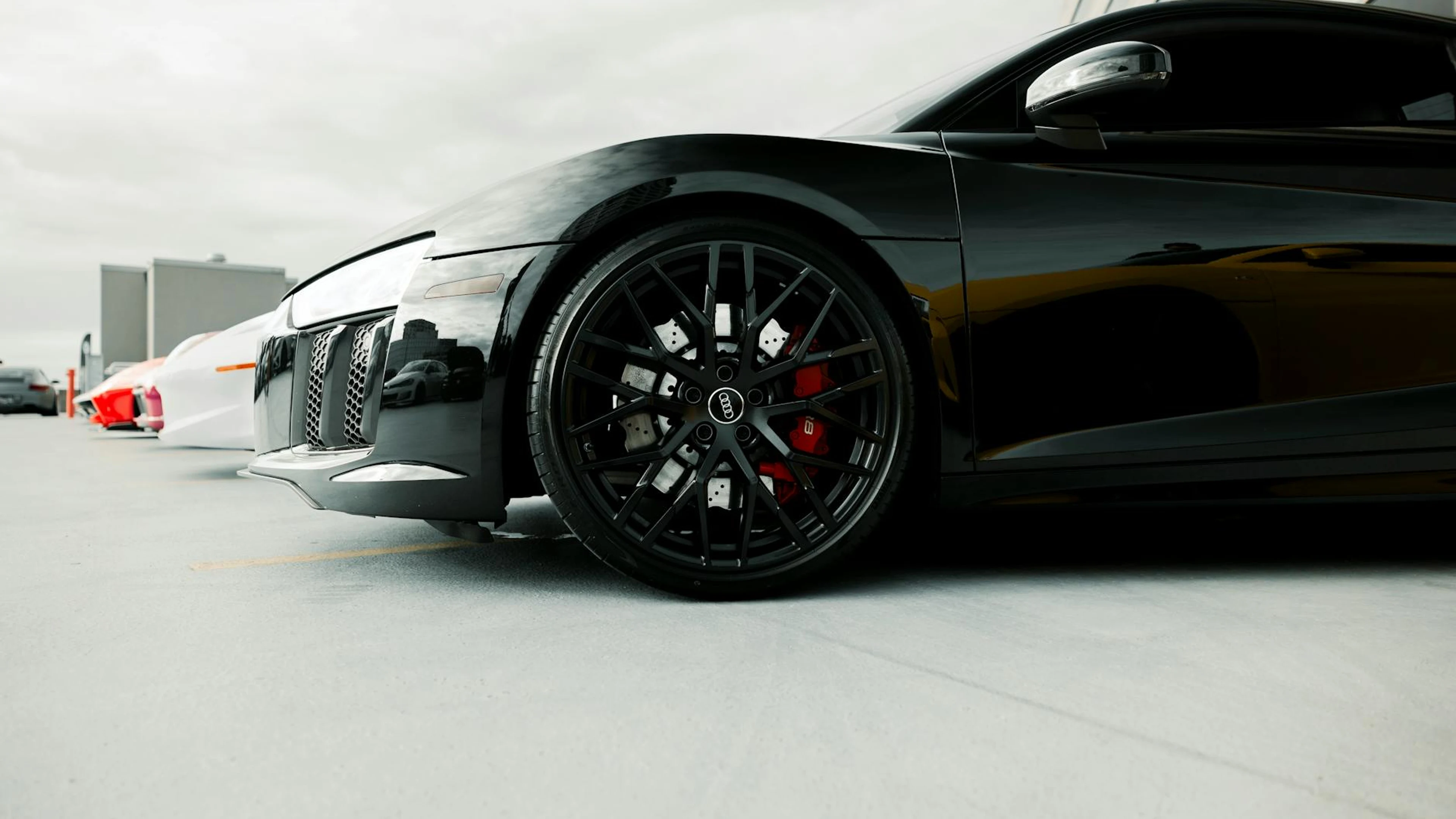 Close-up of a black luxury sports car's wheel detail in an outdoor setting.