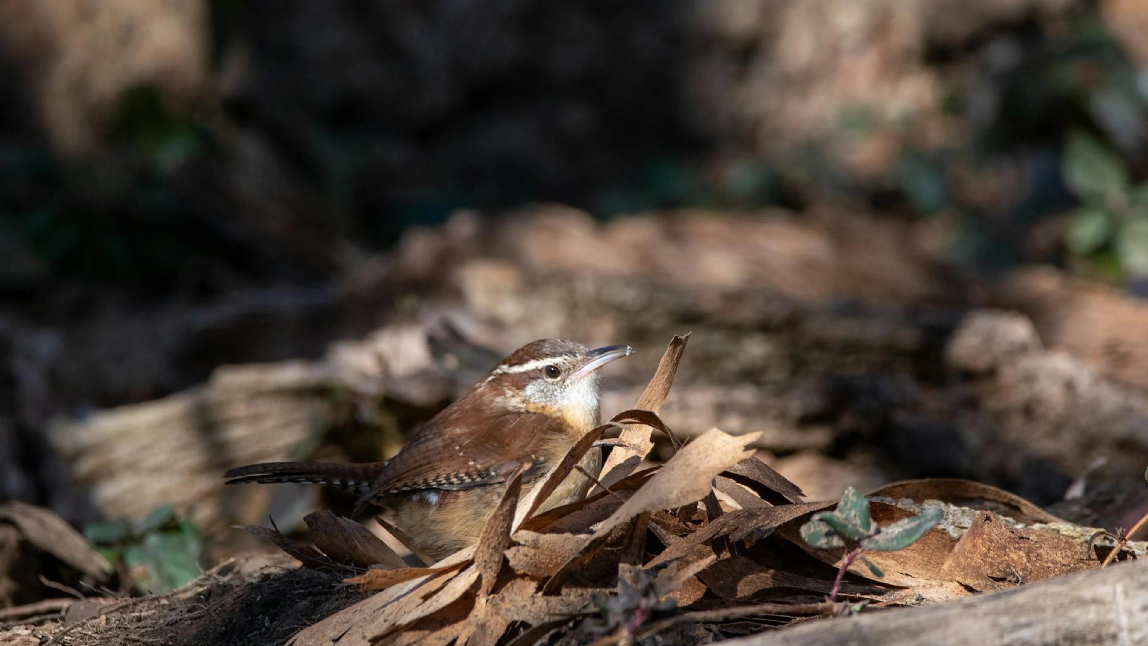 Download Close-up of a Carolina Wren searching for food amongst dry leaves in a forest se wallpaper for free. 3840x2160 4K Ultra HD resolution, perfect for your desktop. High quality animals wallpaper.