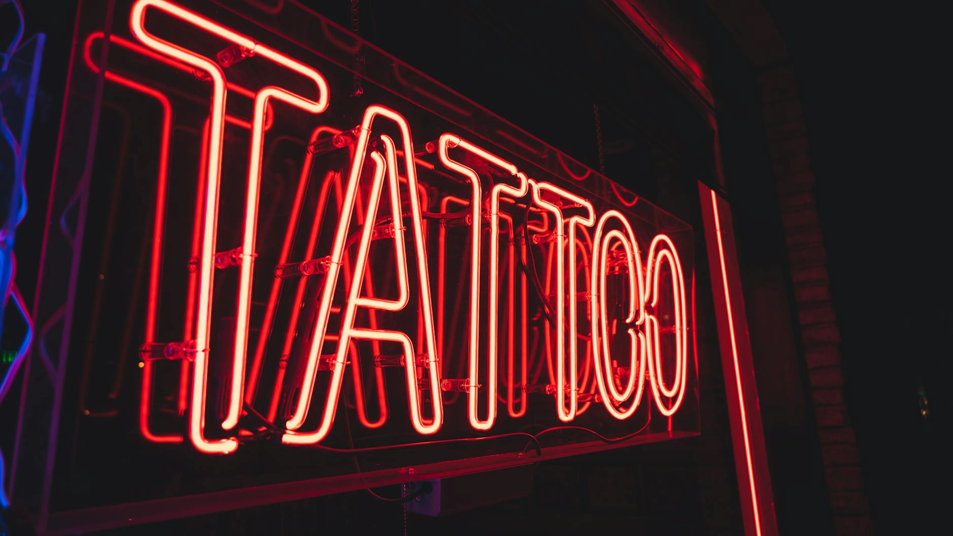 Close-up of a glowing neon tattoo sign, perfect for nightlife and urban themes.