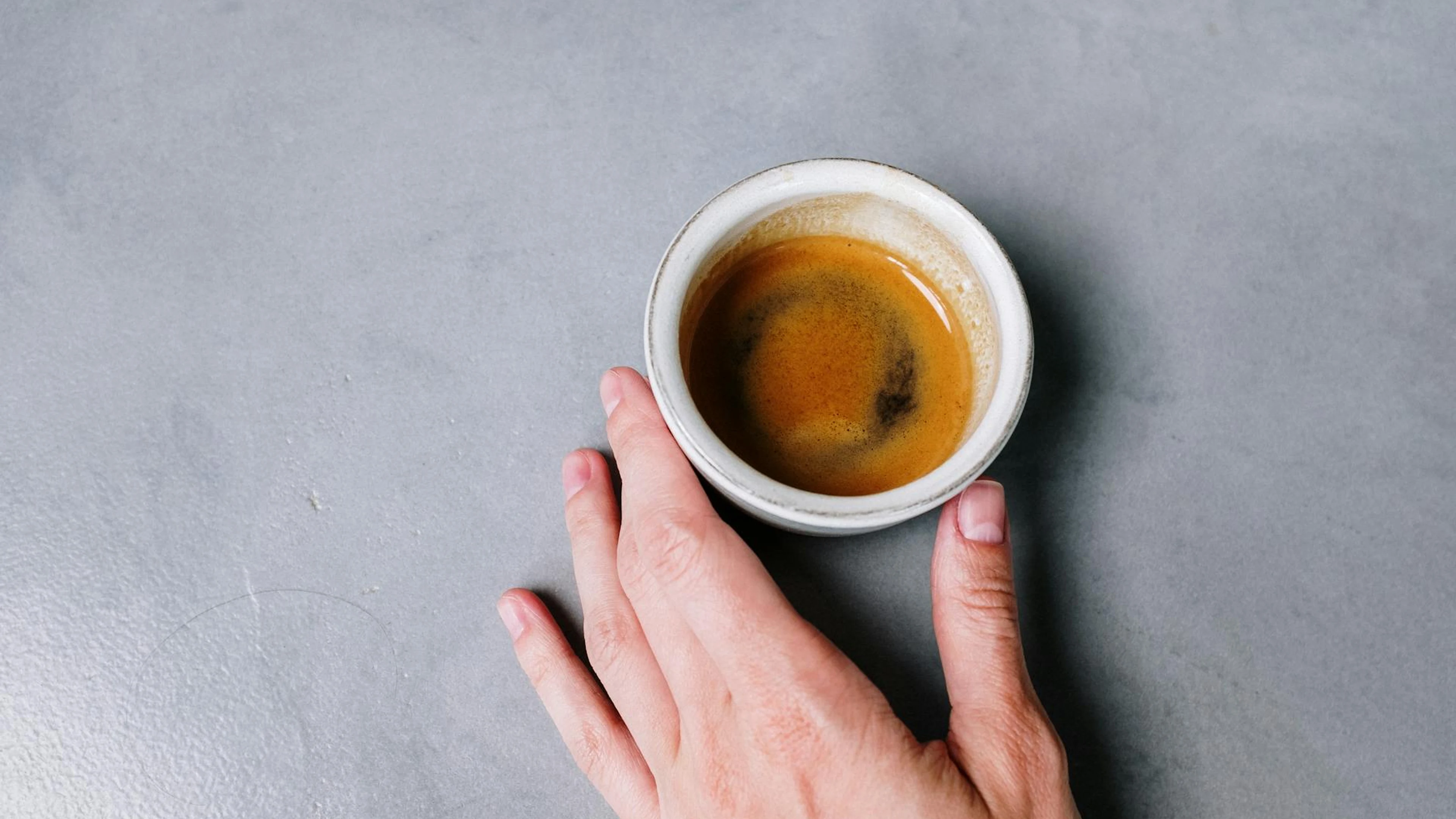 Get this stunning Close-up of a hand holding an espresso cup on a gray concrete surface. Minimalis wallpaper in 4K Ultra HD quality. 3840x2160 minimal wallpaper available for free download.