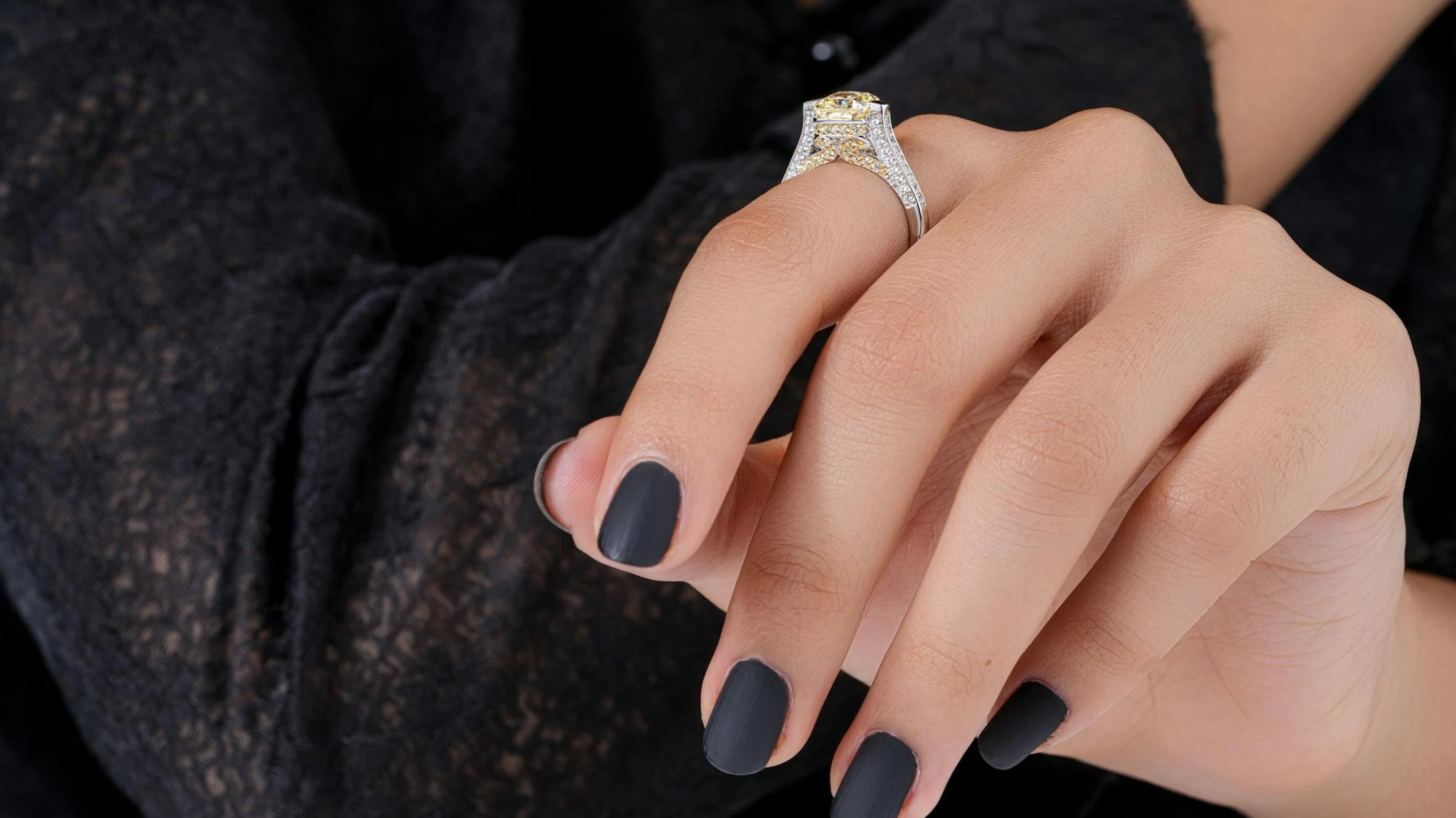 Download Close-up of a hand showcasing a diamond ring with matte black nail polish, ideal wallpaper for free. 3840x2160 4K Ultra HD resolution, perfect for your desktop. High quality gaming wallpaper.