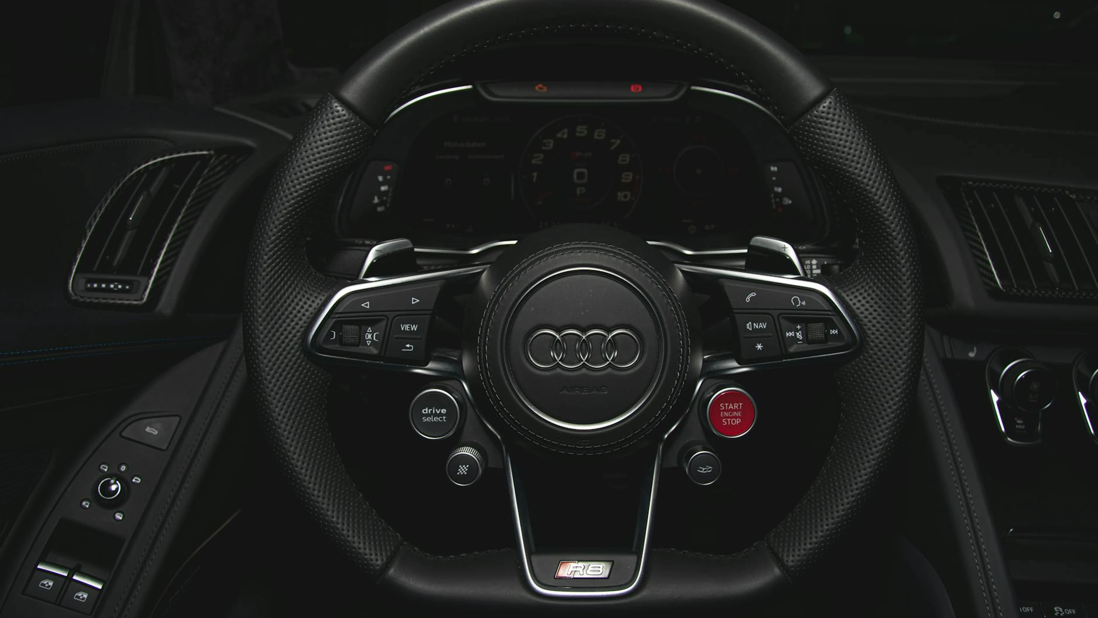Free Close-up of a luxury car steering wheel featuring control buttons and logo. wallpaper in 4K Ultra HD resolution (3840x2160). Beautiful architecture background for your screen. No signup required.