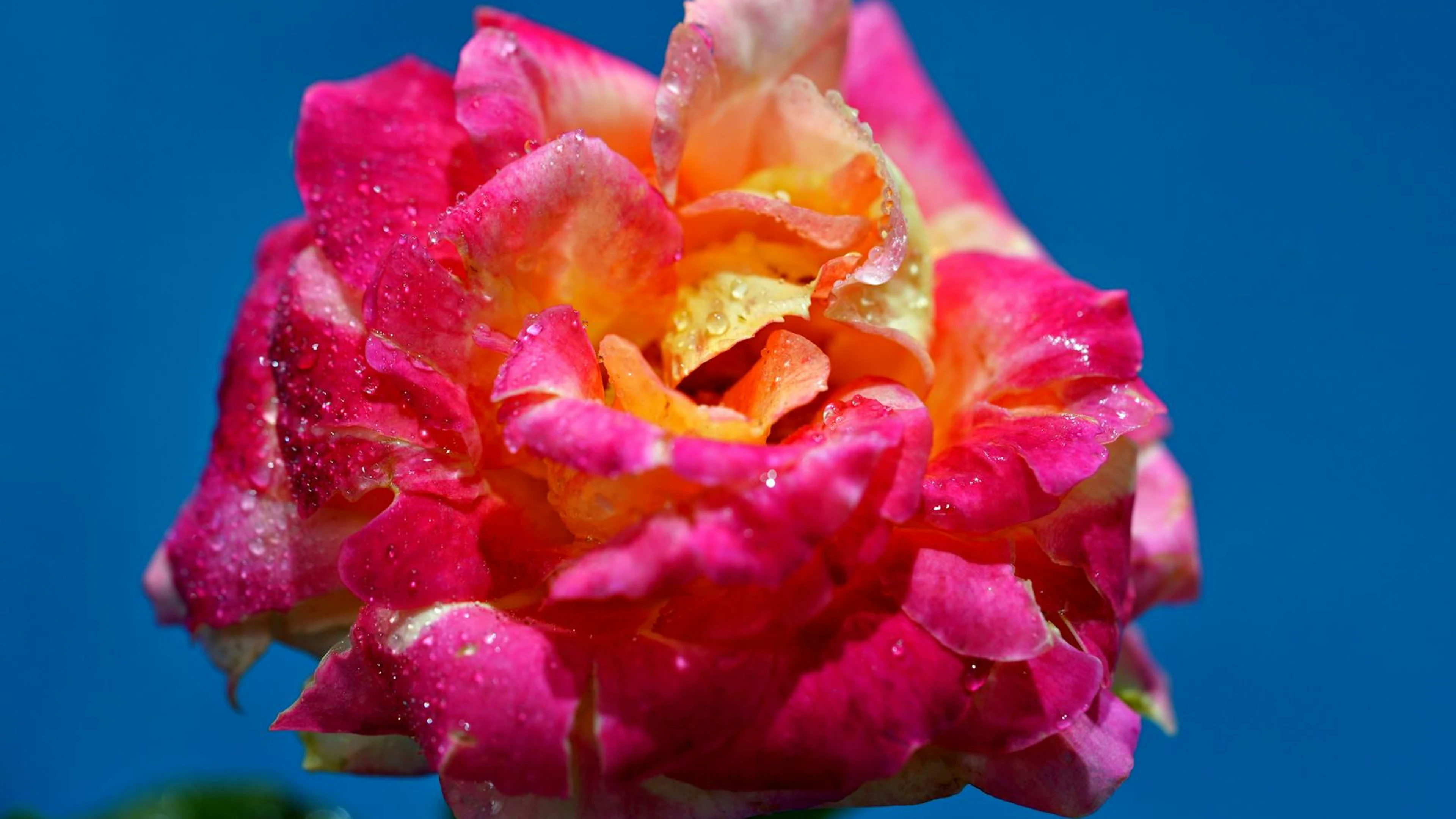 Free Close-up of a vibrant pink rose with dewdrops, set against a clear blue sky, sho wallpaper in 4K Ultra HD resolution (3840x2160). Beautiful flowers background for your screen. No signup required.