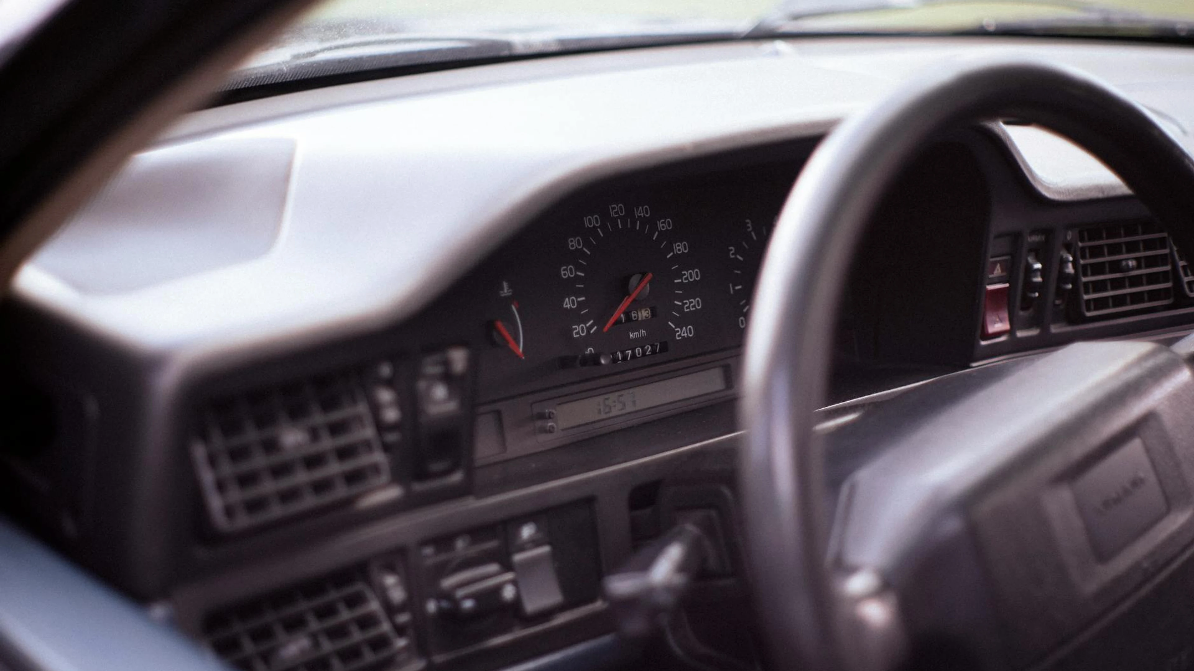 Close-up of a vintage car dashboard and steering wheel, showcasing the speedomet