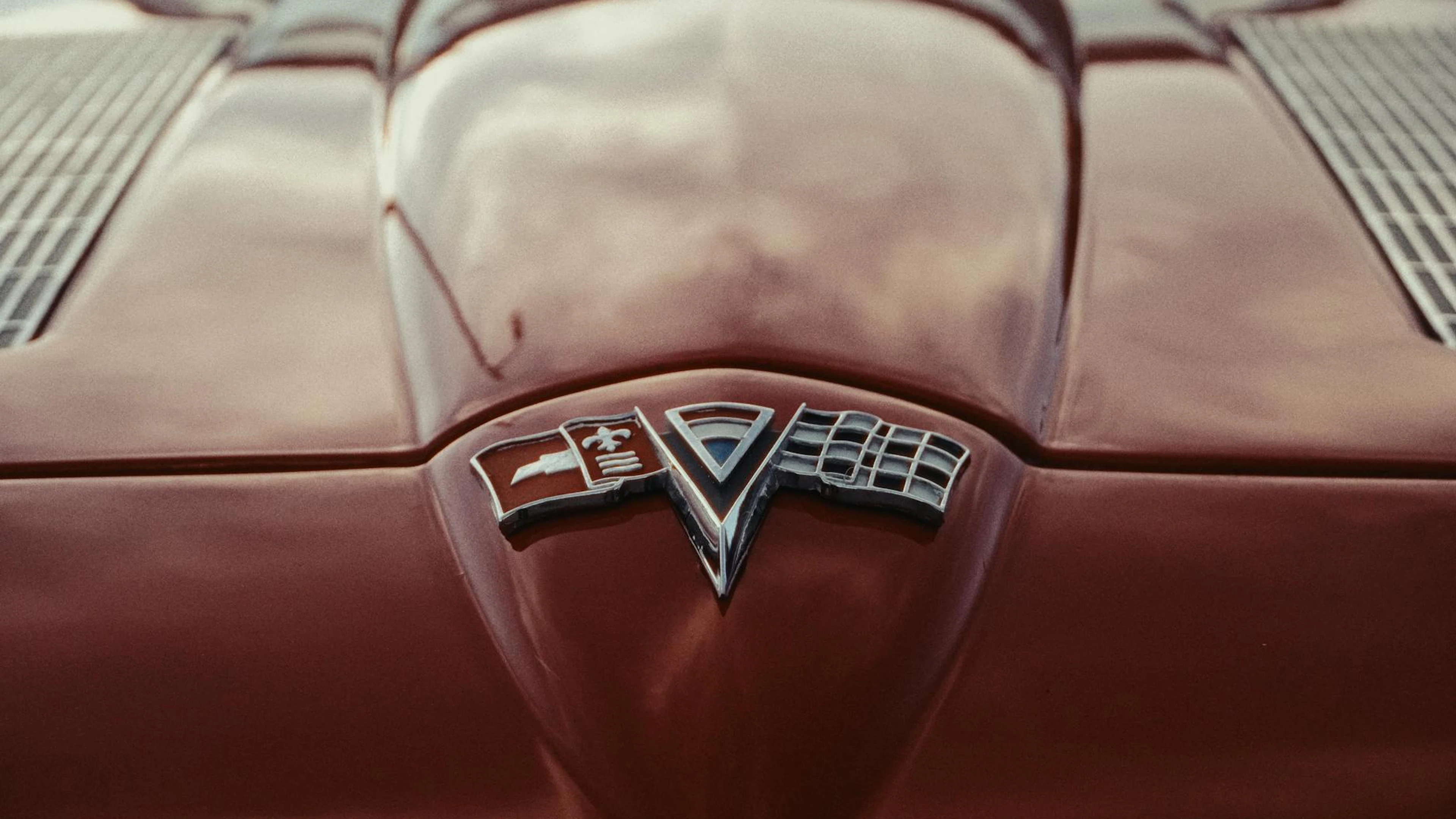Download Close-up of a vintage red car hood featuring a classic emblem, reflective of 196 wallpaper for free. 3840x2160 4K Ultra HD resolution, perfect for your desktop. High quality aesthetic wallpaper.