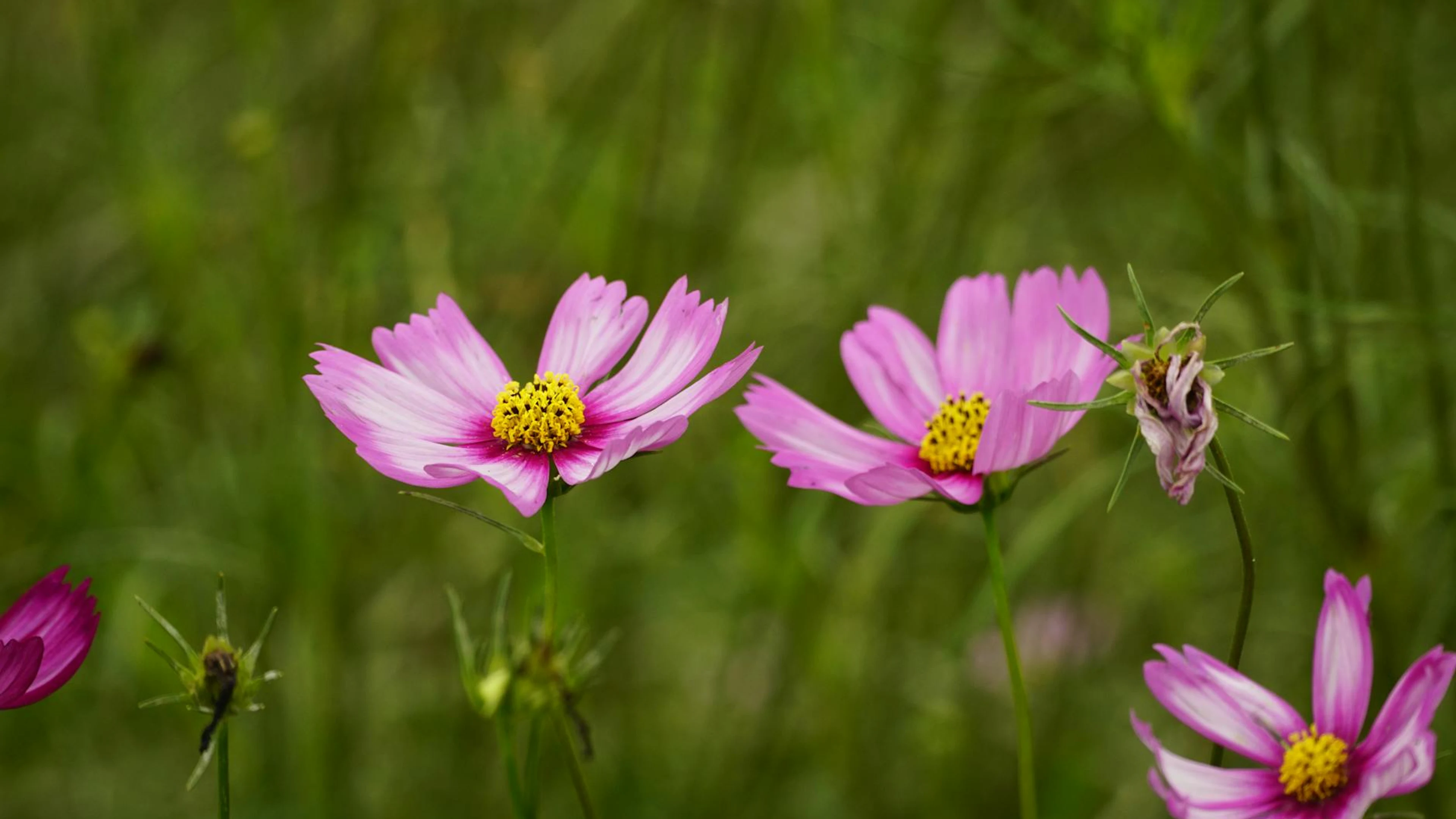 Download Close-up of beautiful pink cosmos flowers with yellow centers in a lush green se wallpaper for free. 3840x2160 4K Ultra HD resolution, perfect for your desktop. High quality flowers wallpaper.