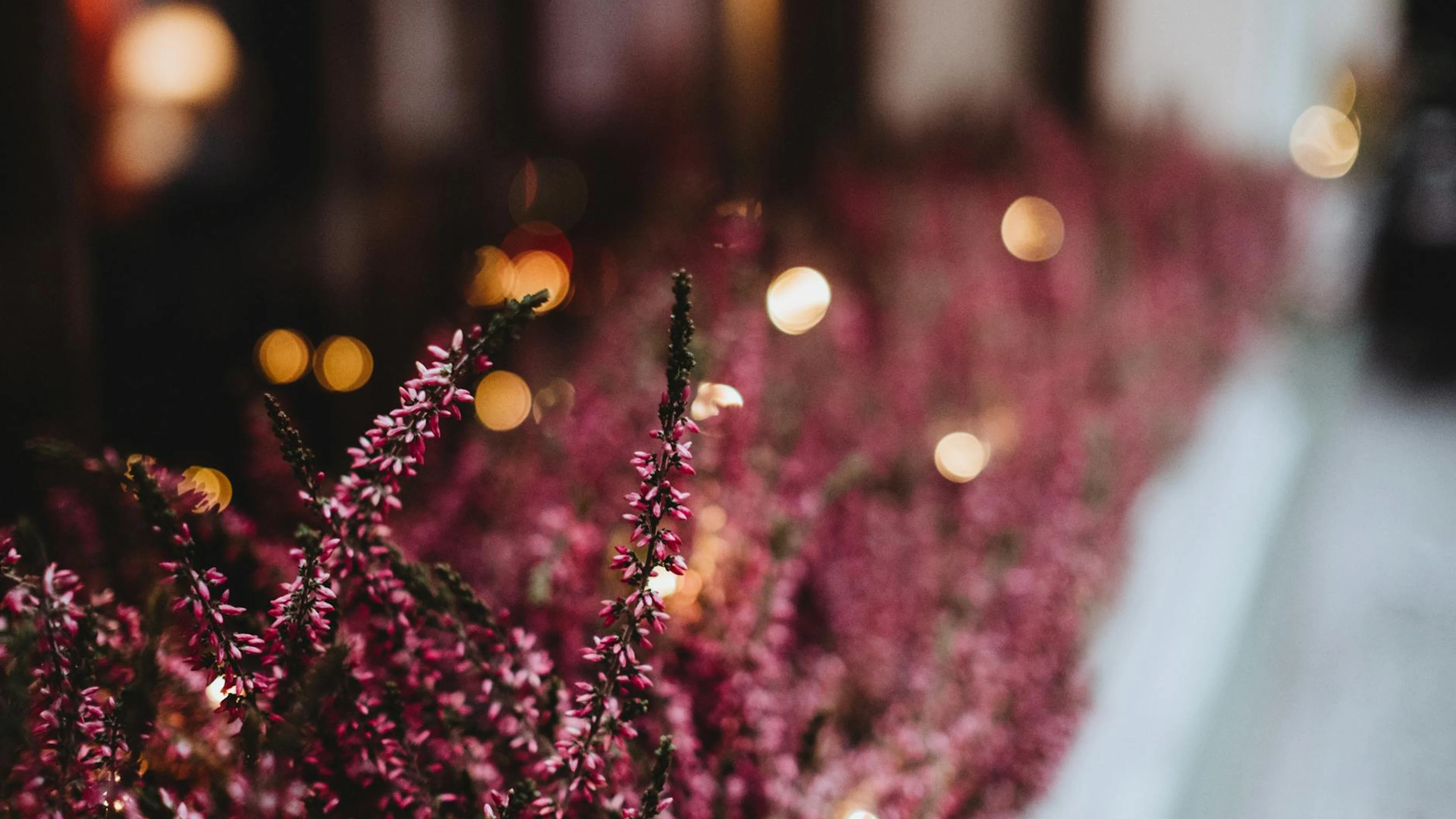 Free Close-up of blooming heather flowers with warm bokeh lights, creating a dreamy a wallpaper in 4K Ultra HD resolution (3840x2160). Beautiful aesthetic background for your screen. No signup required.
