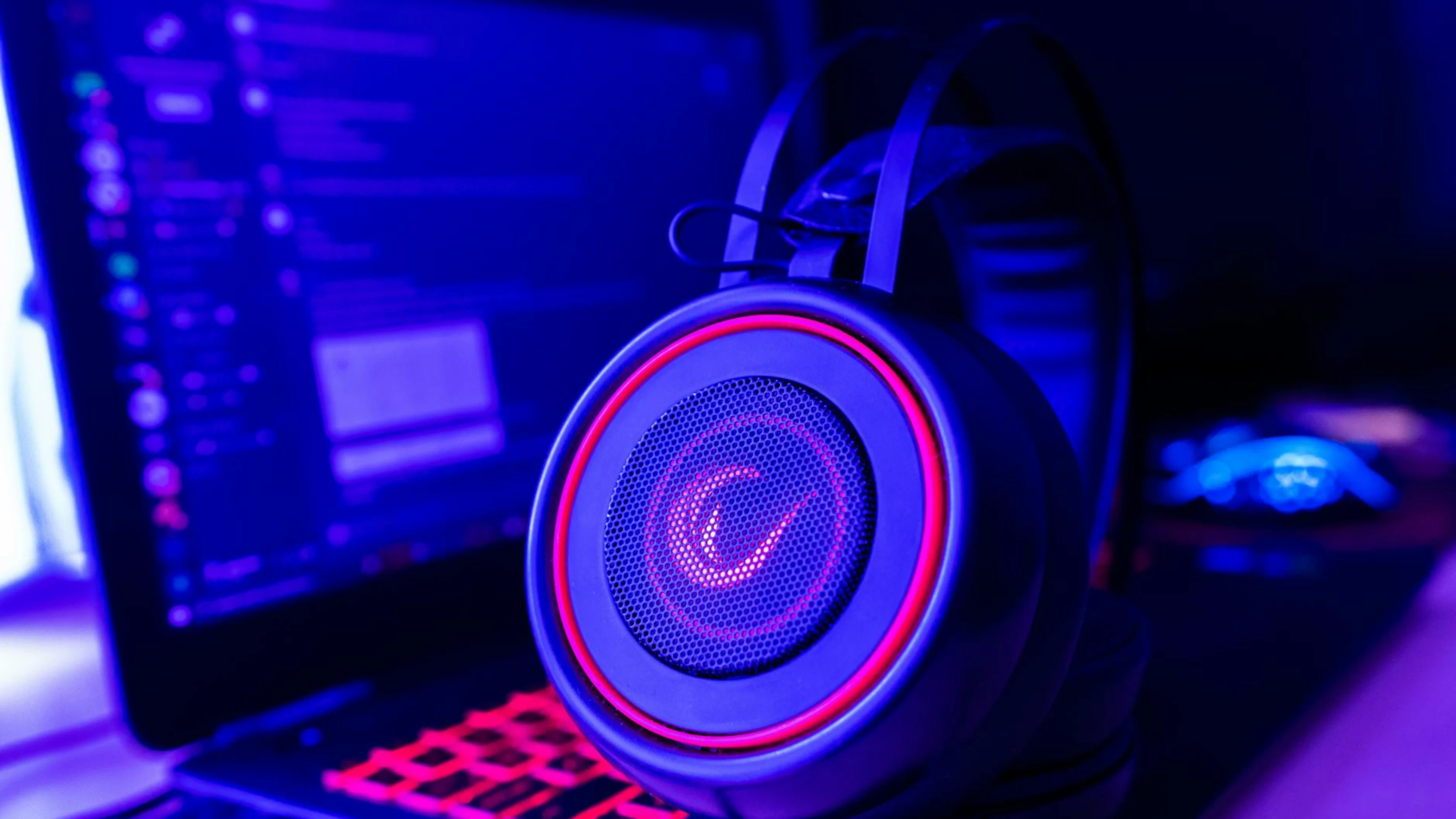 Close-up of gaming headset with neon lighting, placed next to a laptop. Perfect