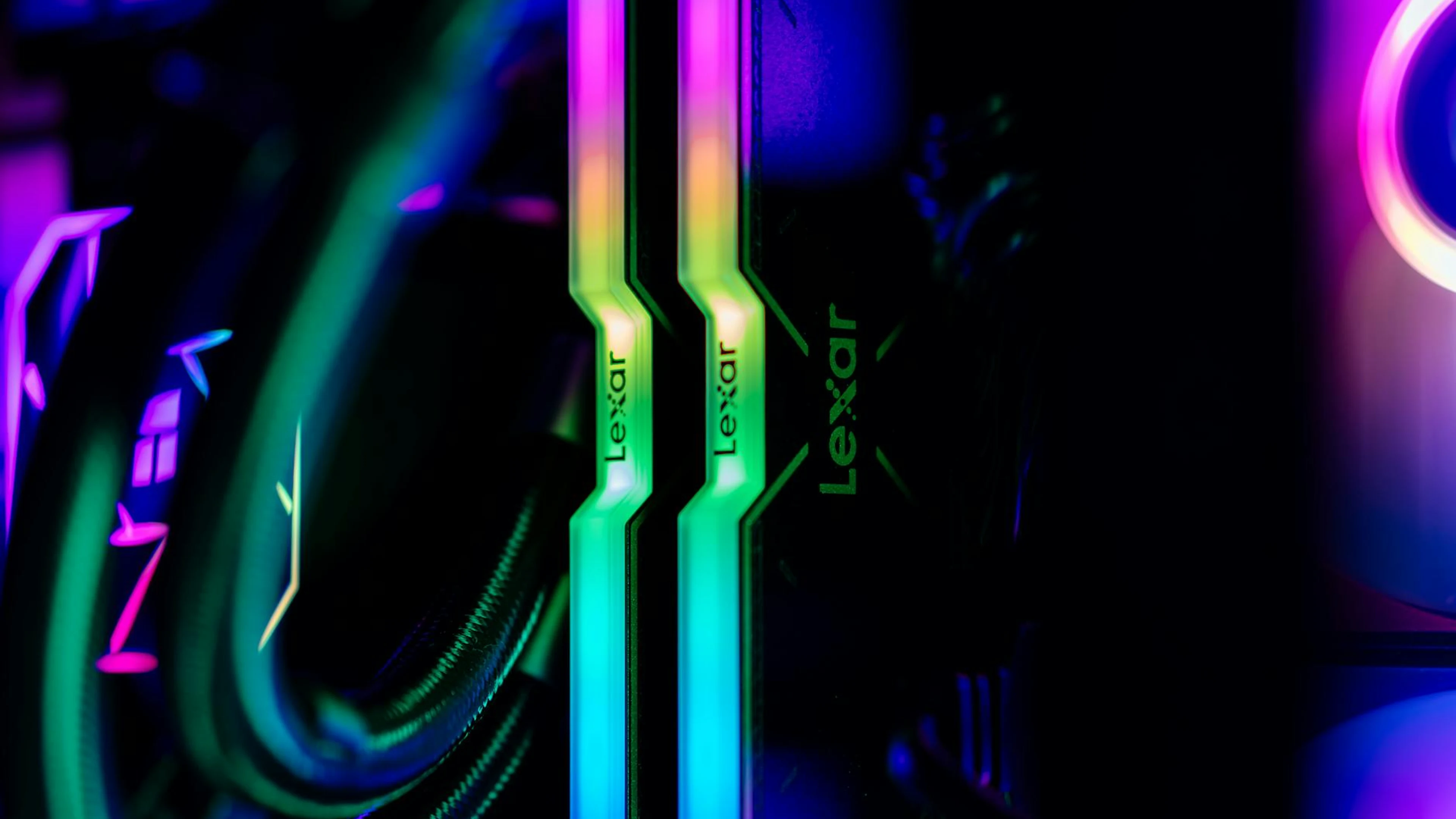 Close-up of RGB lighting on Lexar memory sticks inside a custom gaming PC case,