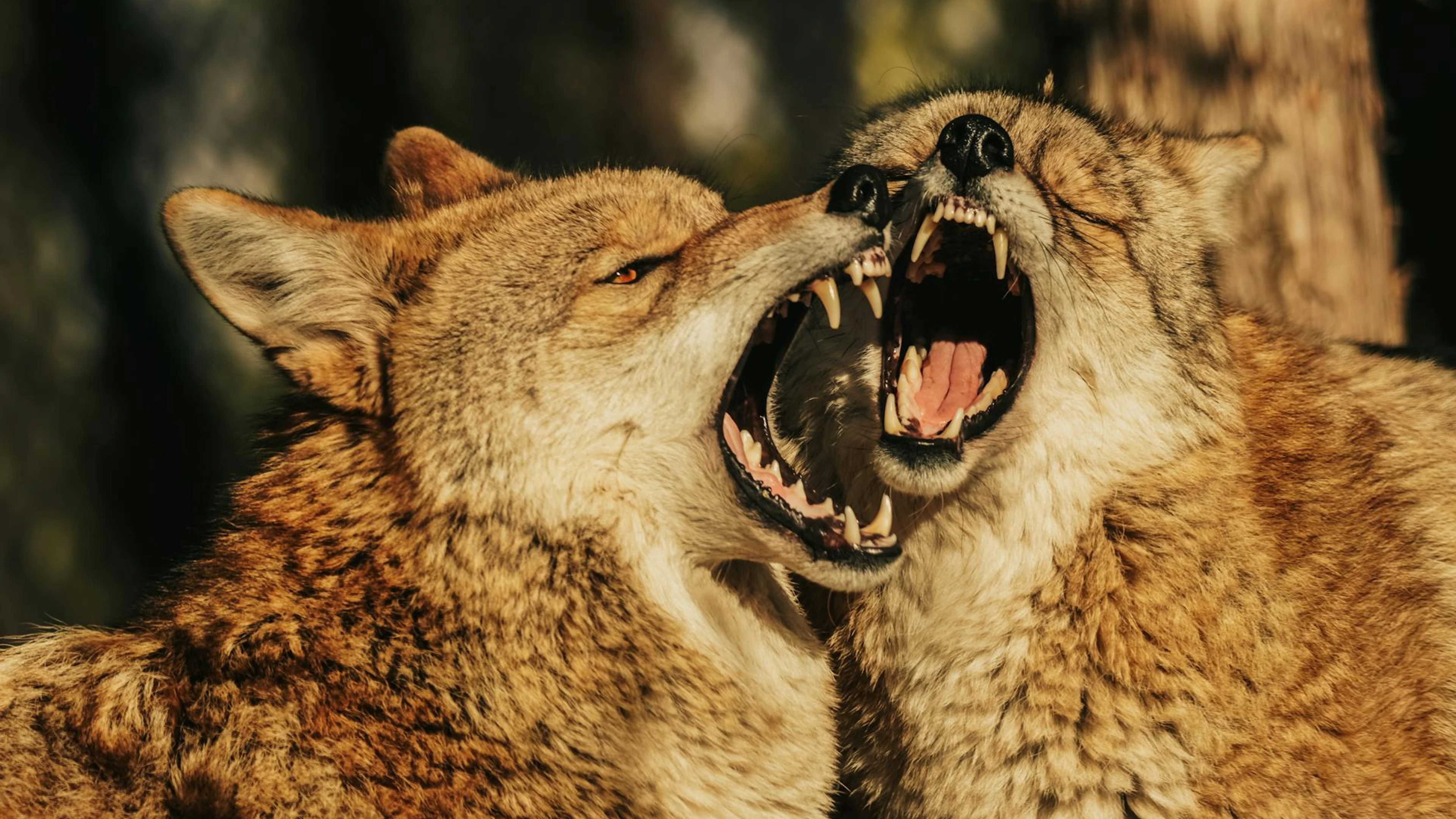 Download Close-up of two coyotes with open mouths engaged in a playful but fierce interac wallpaper for free. 3840x2160 4K Ultra HD resolution, perfect for your desktop. High quality anime wallpaper.