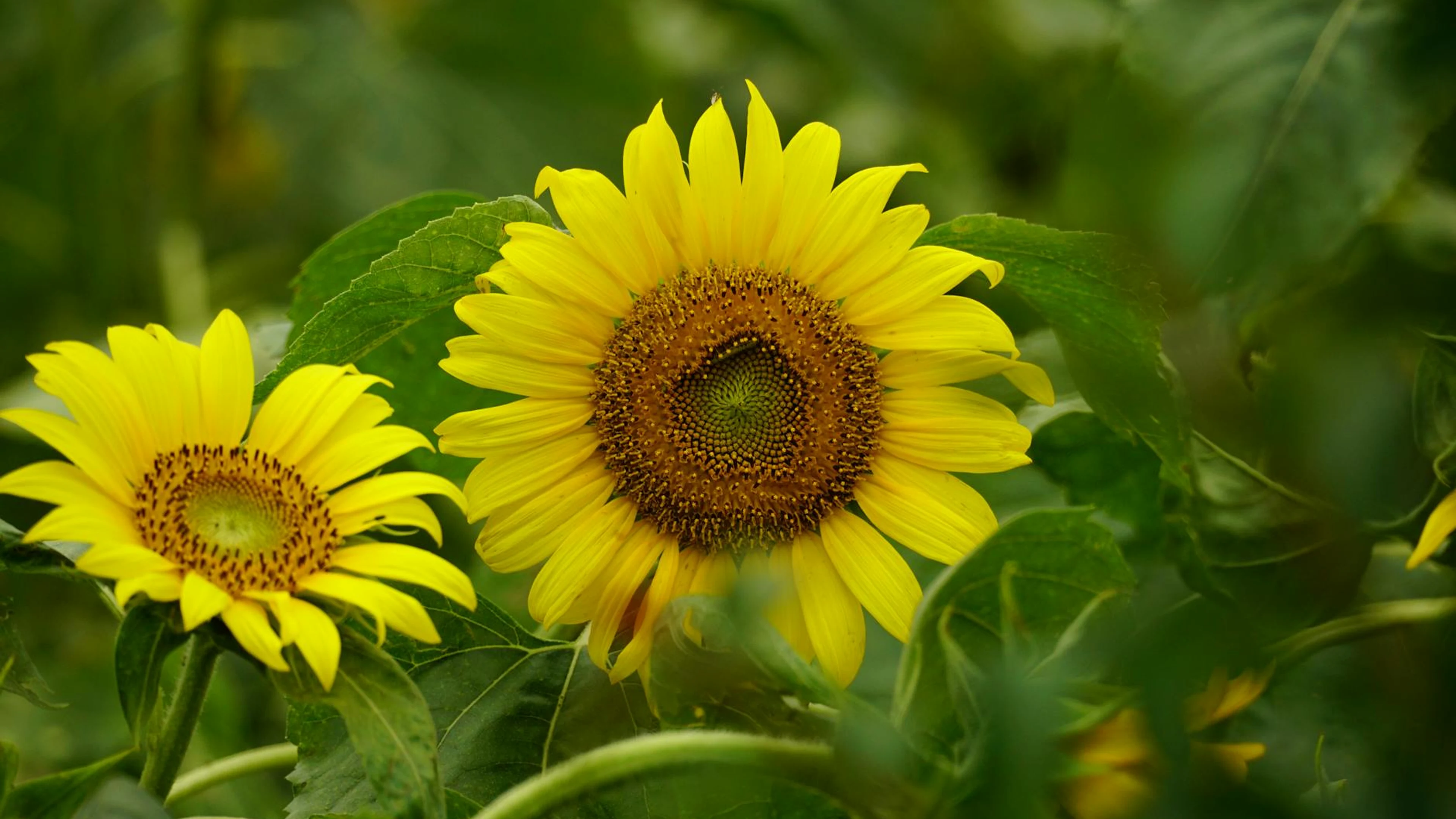 Free Close-up of vibrant sunflowers with green leaves in sunlight. wallpaper in 4K Ultra HD resolution (3840x2160). Beautiful flowers background for your screen. No signup required.
