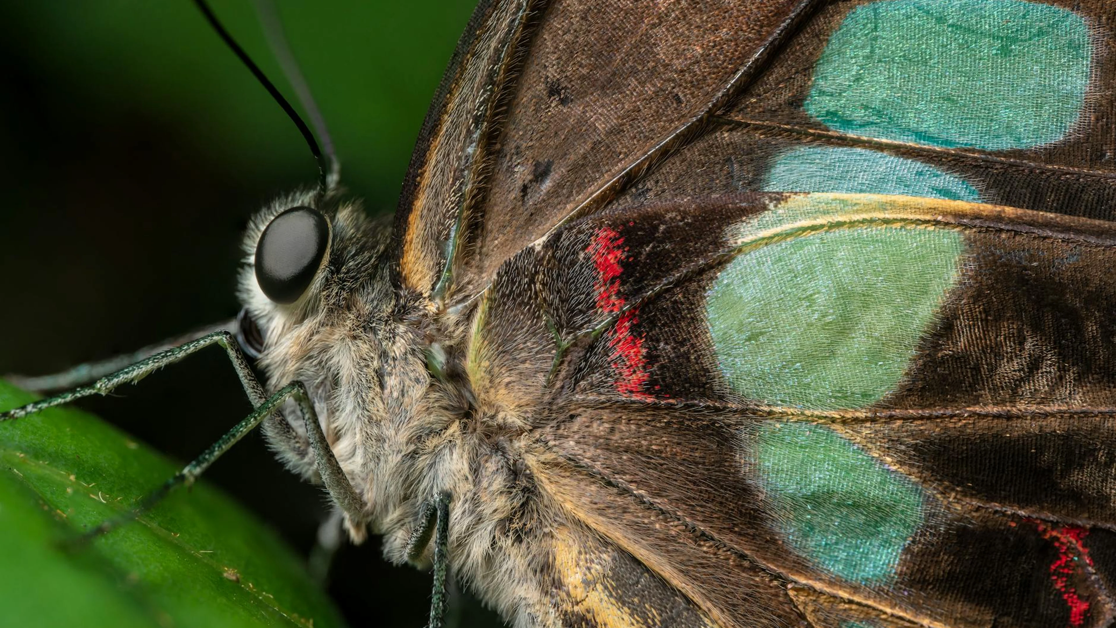 Download Close-up shot of a colorful butterfly resting on green foliage, showcasing intri wallpaper for free. 3840x2160 4K Ultra HD resolution, perfect for your desktop. High quality macro wallpaper.