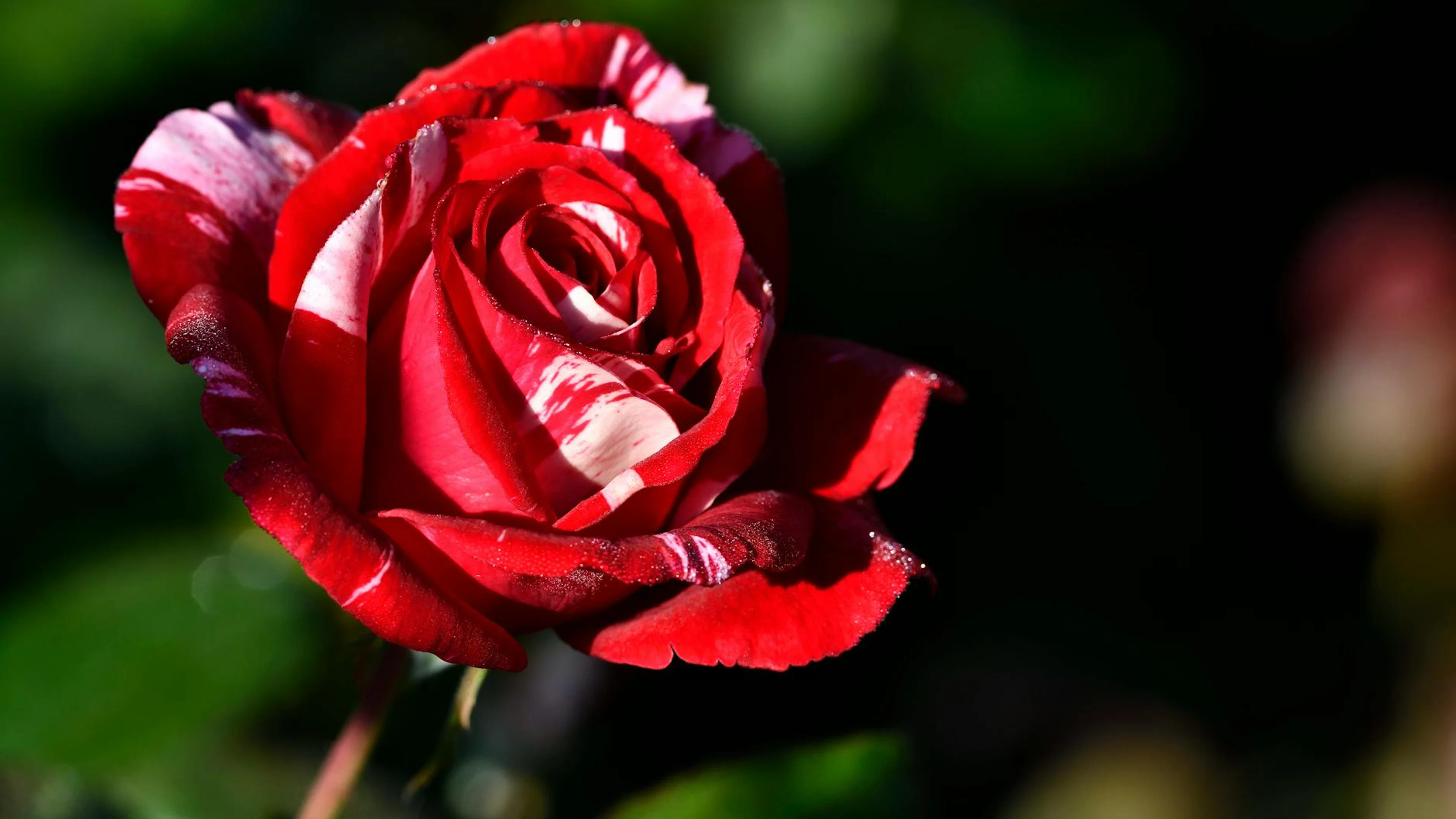 Free Close-up shot of a red and white rose with dew, showcasing vivid colors and natu wallpaper in 4K Ultra HD resolution (3840x2160). Beautiful flowers background for your screen. No signup required.