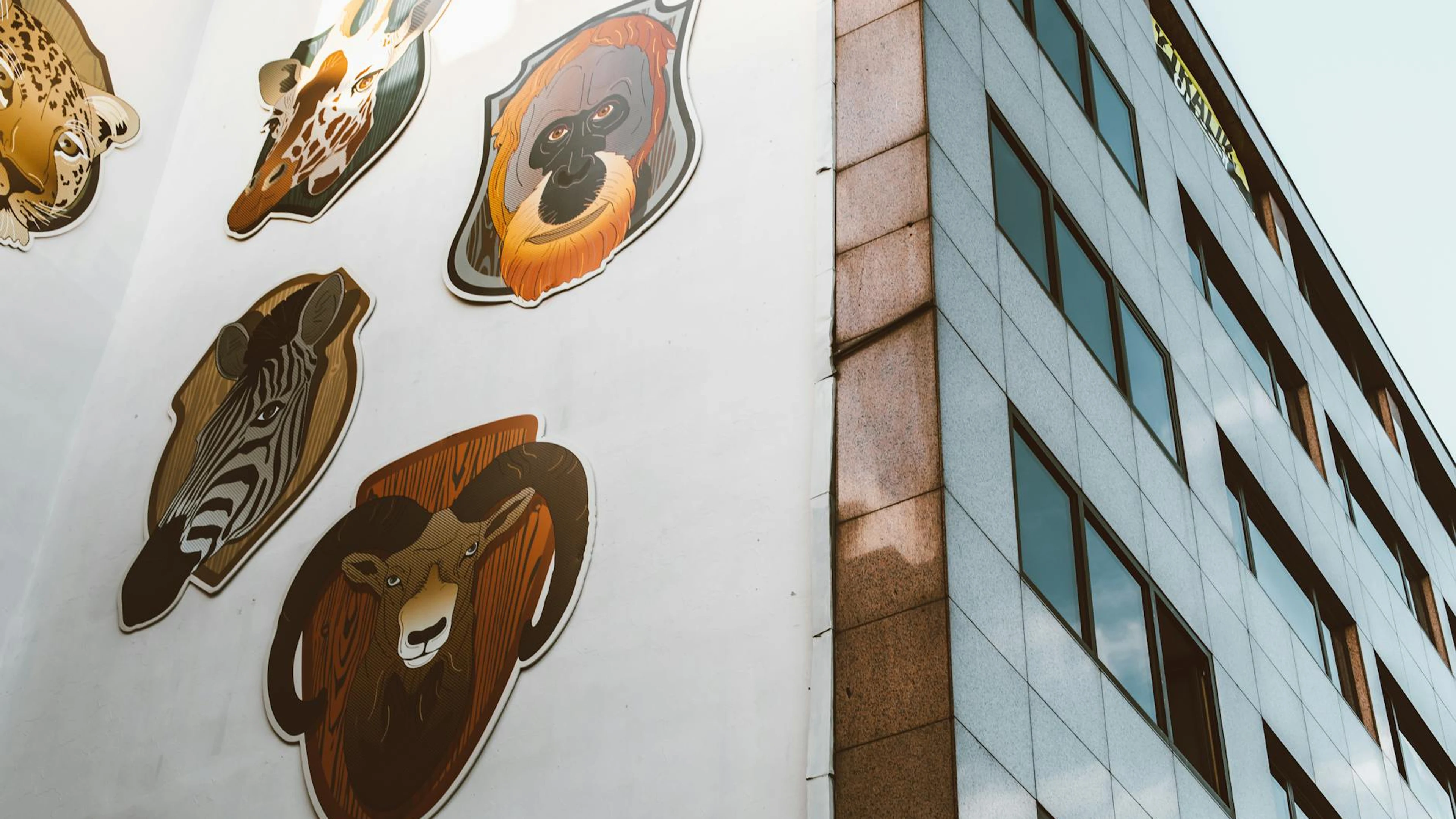 Creative animal mural displayed on the side of a city skyscraper, featuring dive