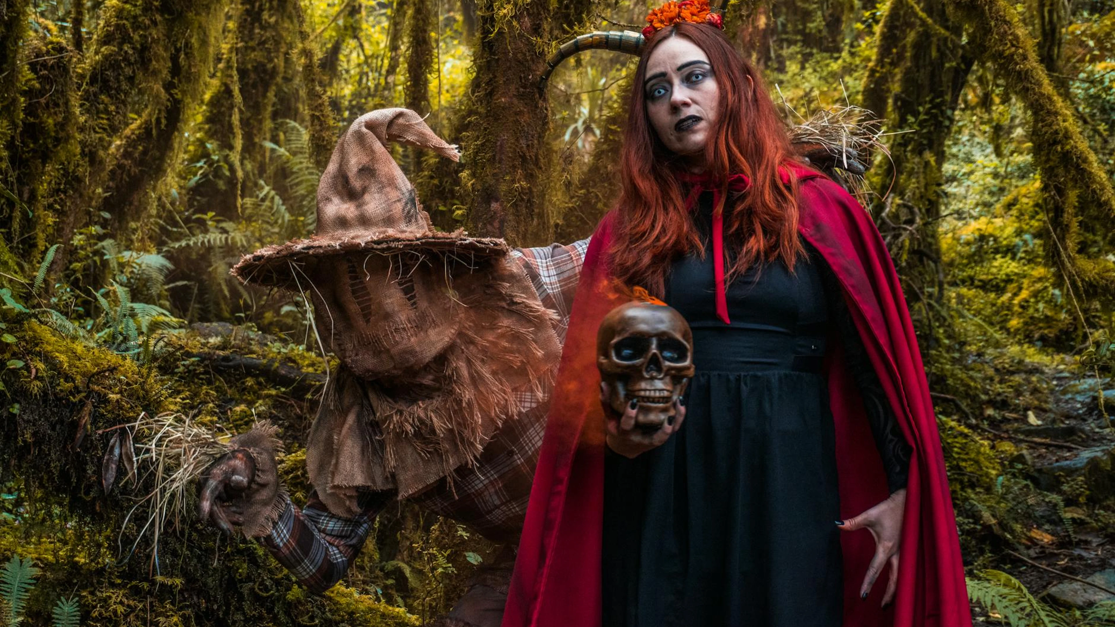 Free Creepy Halloween characters wearing costumes in Choachí's eerie forest setting. wallpaper in 4K Ultra HD resolution (3840x2160). Beautiful fantasy background for your screen. No signup required.