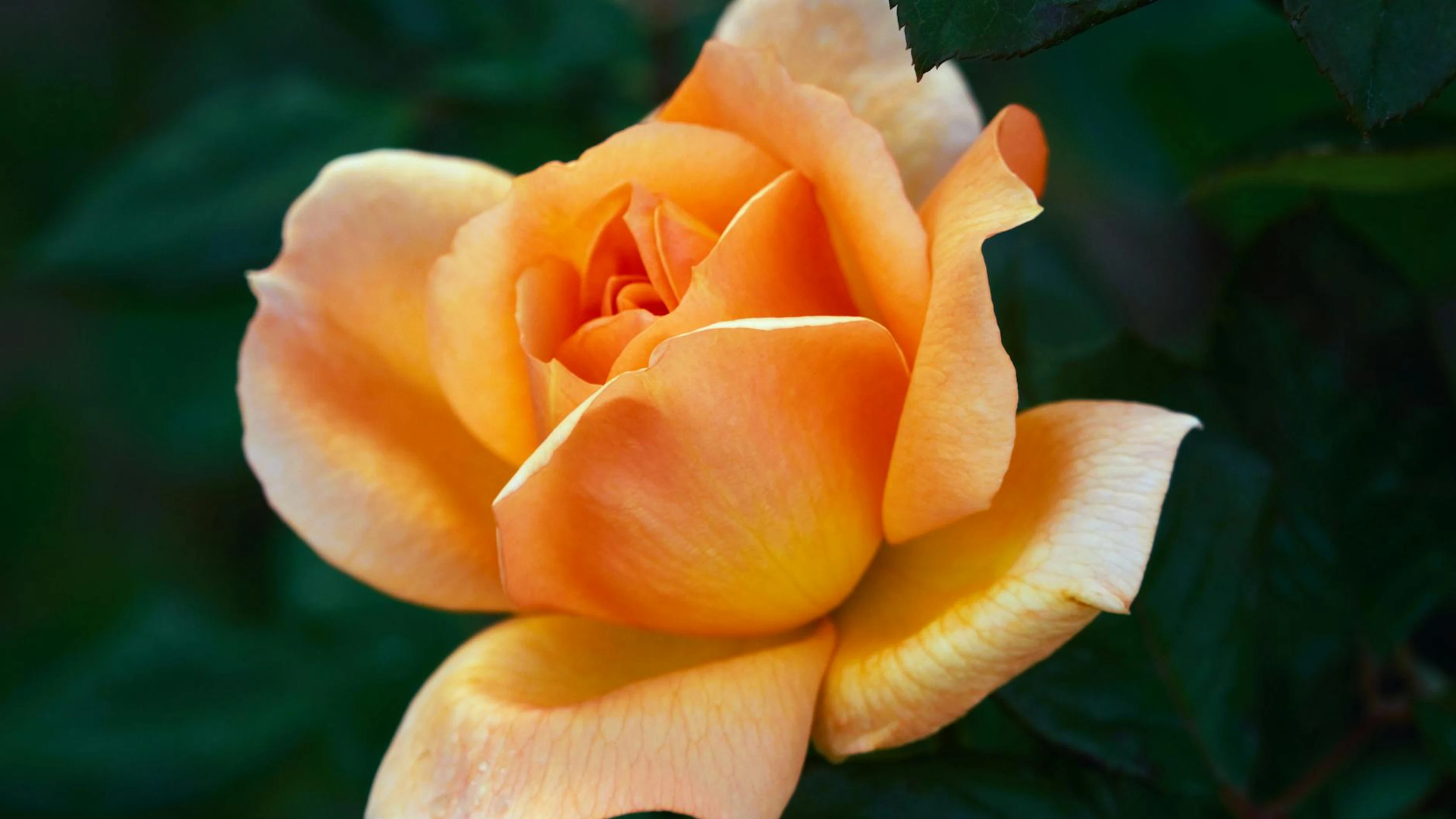 Free Detailed close-up of a blooming orange rose with green leaves. wallpaper in 4K Ultra HD resolution (3840x2160). Beautiful flowers background for your screen. No signup required.