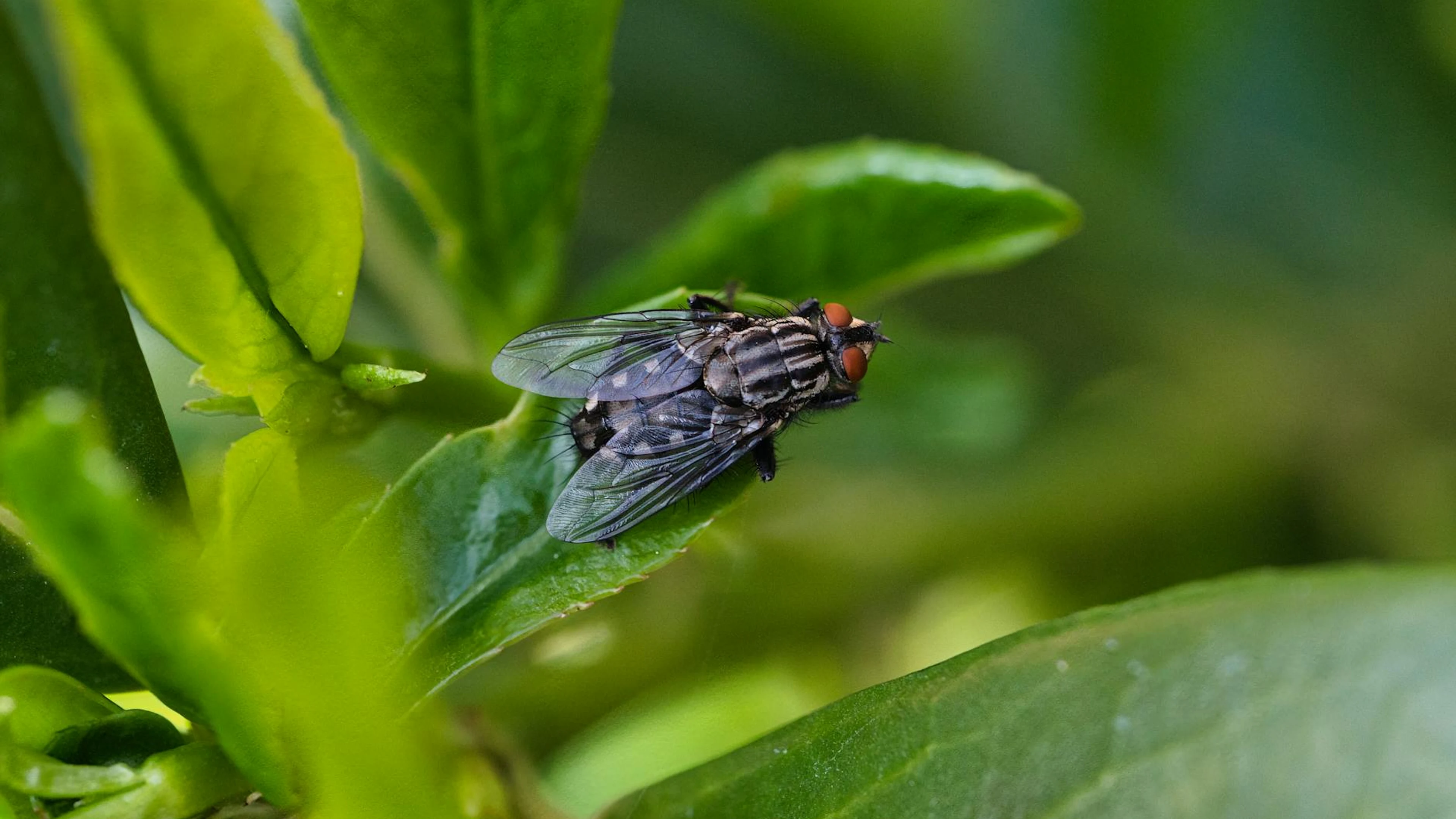 Free Detailed macro shot of a fly perched on a vibrant green leaf, showcasing nature' wallpaper in 4K Ultra HD resolution (3840x2160). Beautiful macro background for your screen. No signup required.