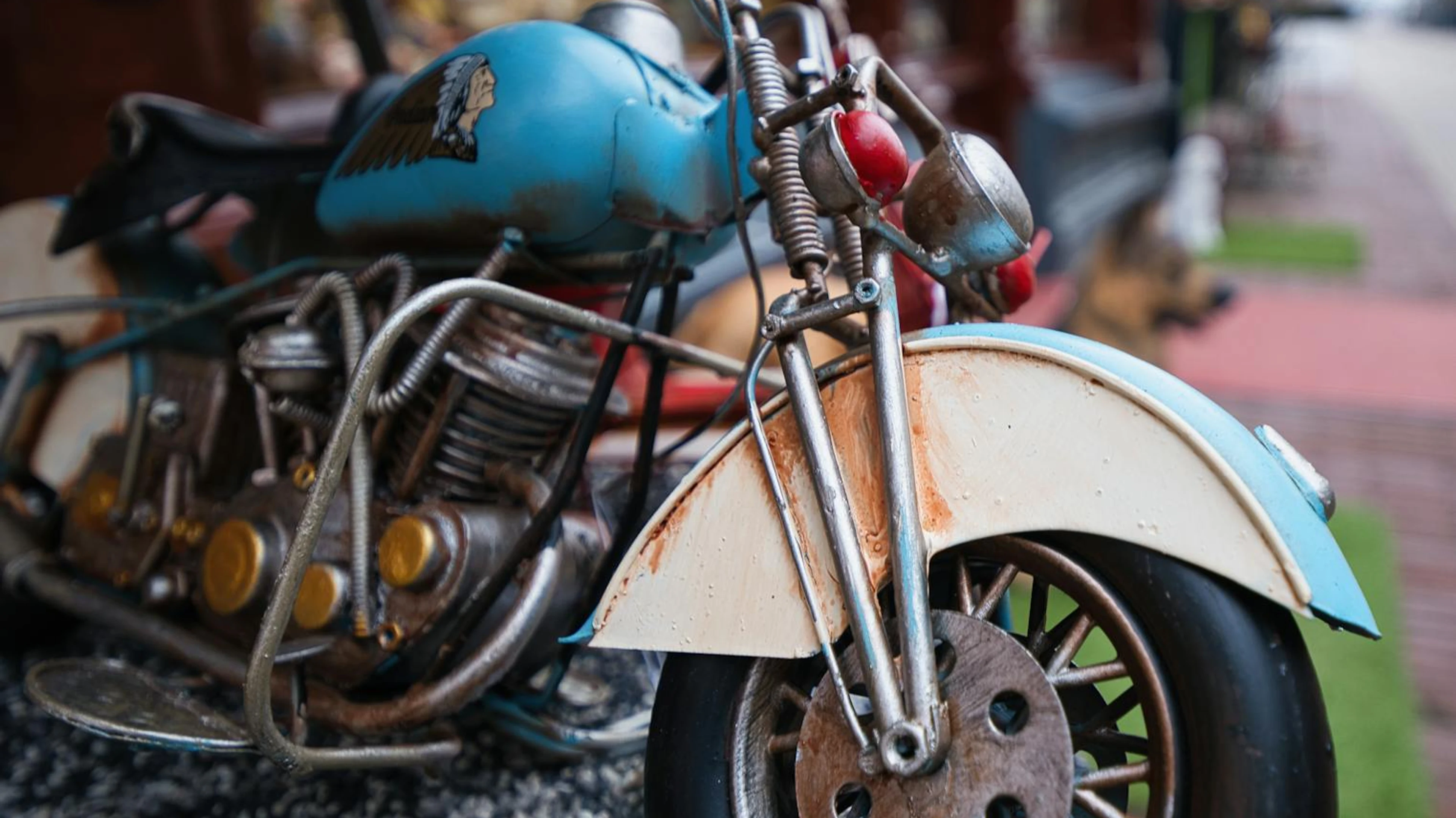 Get this stunning Detailed shot of a vintage blue and white toy motorcycle model displayed outdoor wallpaper in 4K Ultra HD quality. 3840x2160 motorcycle wallpaper available for free download.