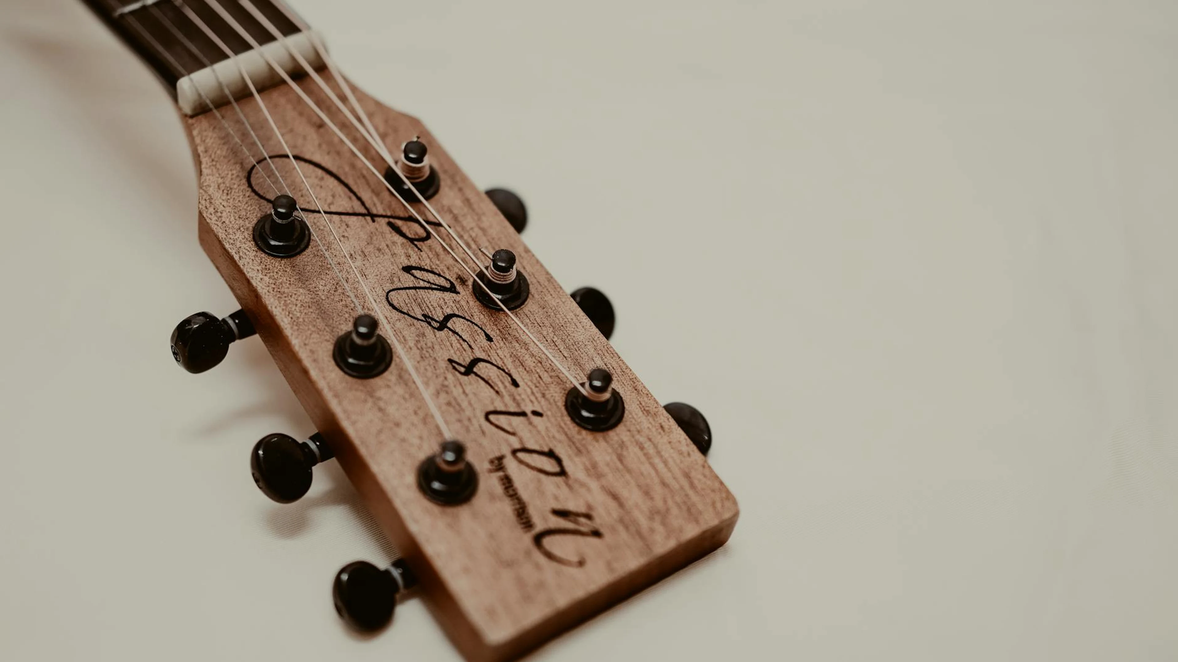 Free Detailed view of a wooden acoustic guitar headstock with tuning pegs. wallpaper in 4K Ultra HD resolution (3840x2160). Beautiful music background for your screen. No signup required.