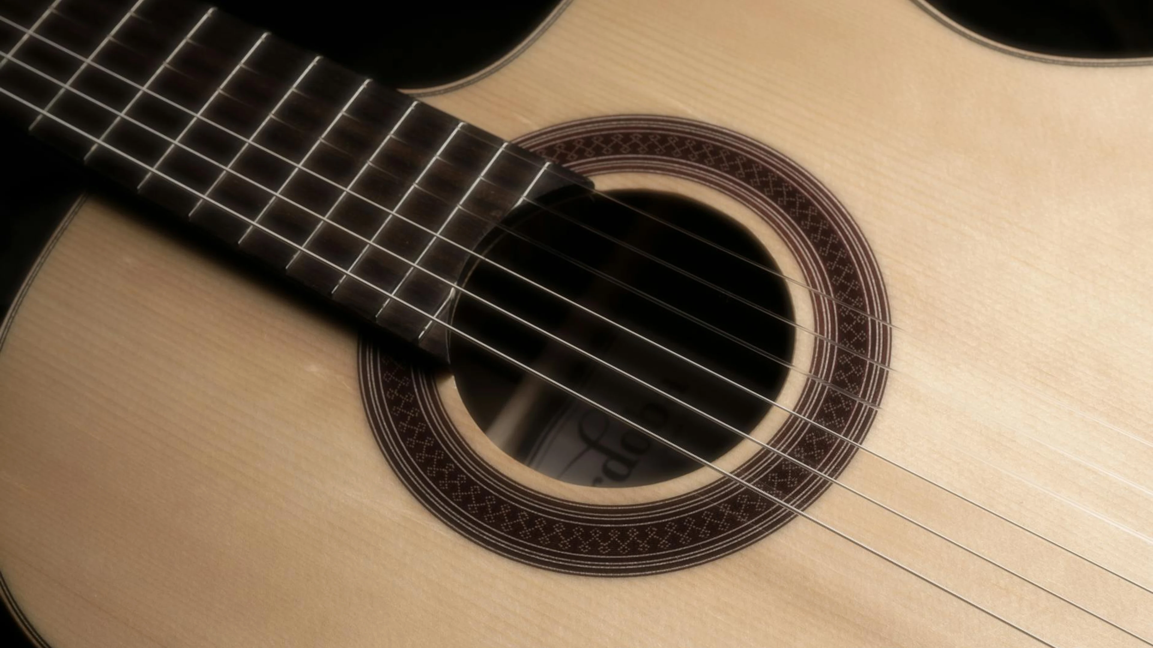 Download Detailed view of acoustic guitar strings and fretboard, showcasing craftsmanship wallpaper for free. 3840x2160 4K Ultra HD resolution, perfect for your desktop. High quality music wallpaper.