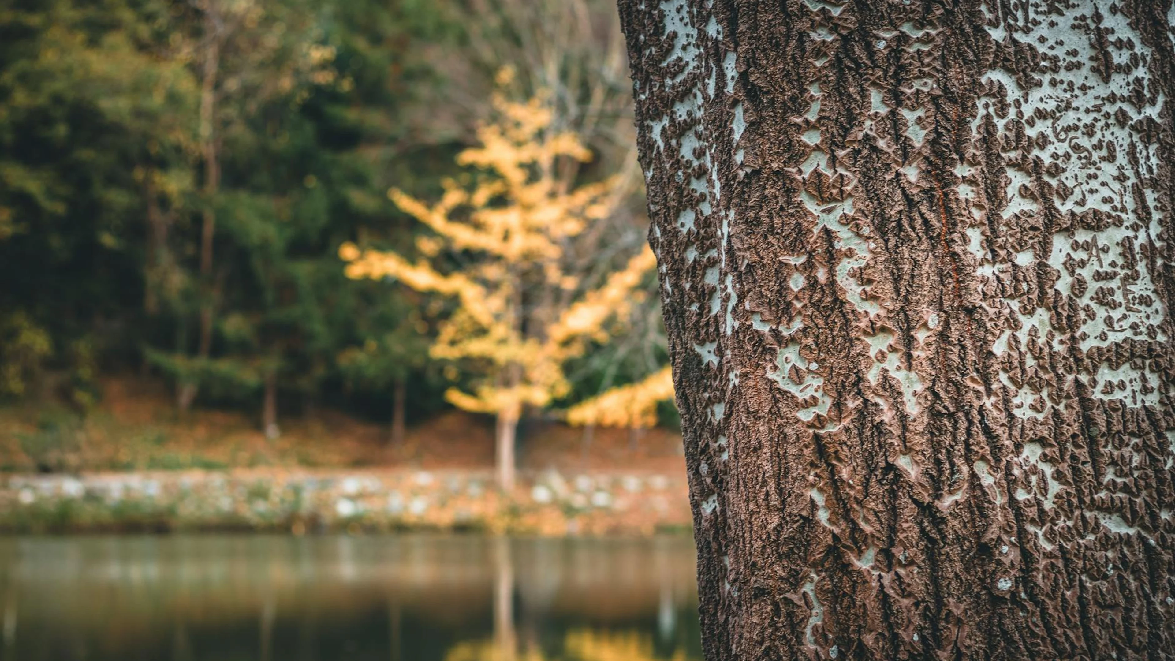 Free Detailed view of tree bark with a blurred autumnal background in an Istanbul par wallpaper in 4K Ultra HD resolution (3840x2160). Beautiful lake background for your screen. No signup required.