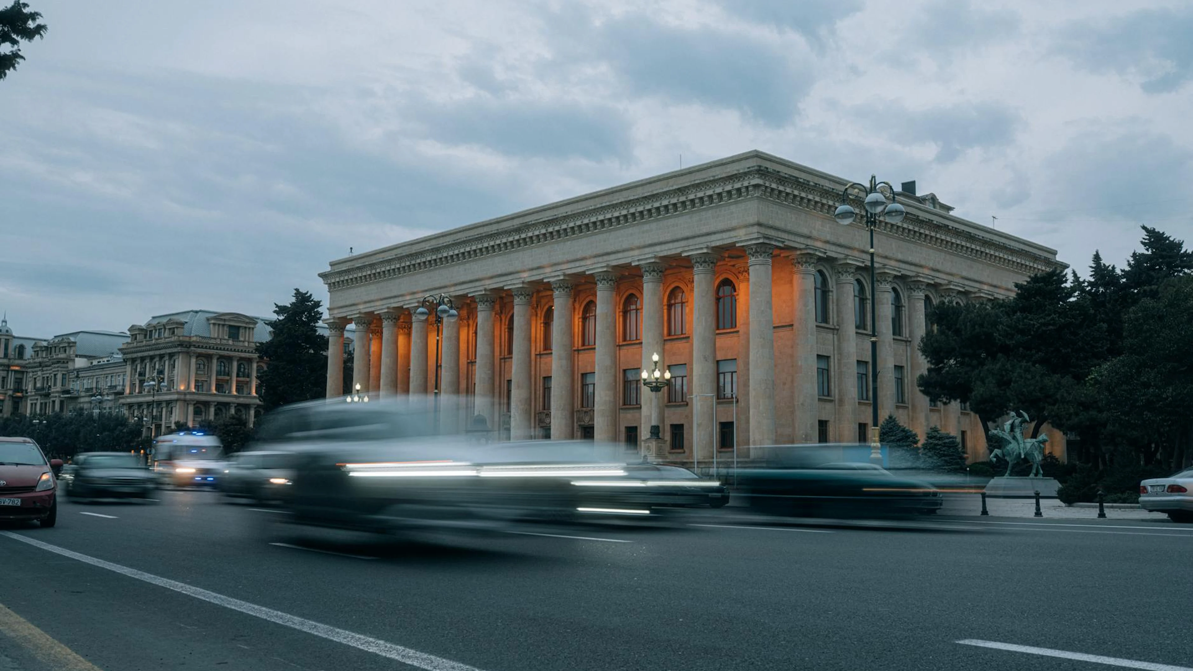 Dramatic scene of cars passing by a lit neoclassical building in Baku at dusk.
