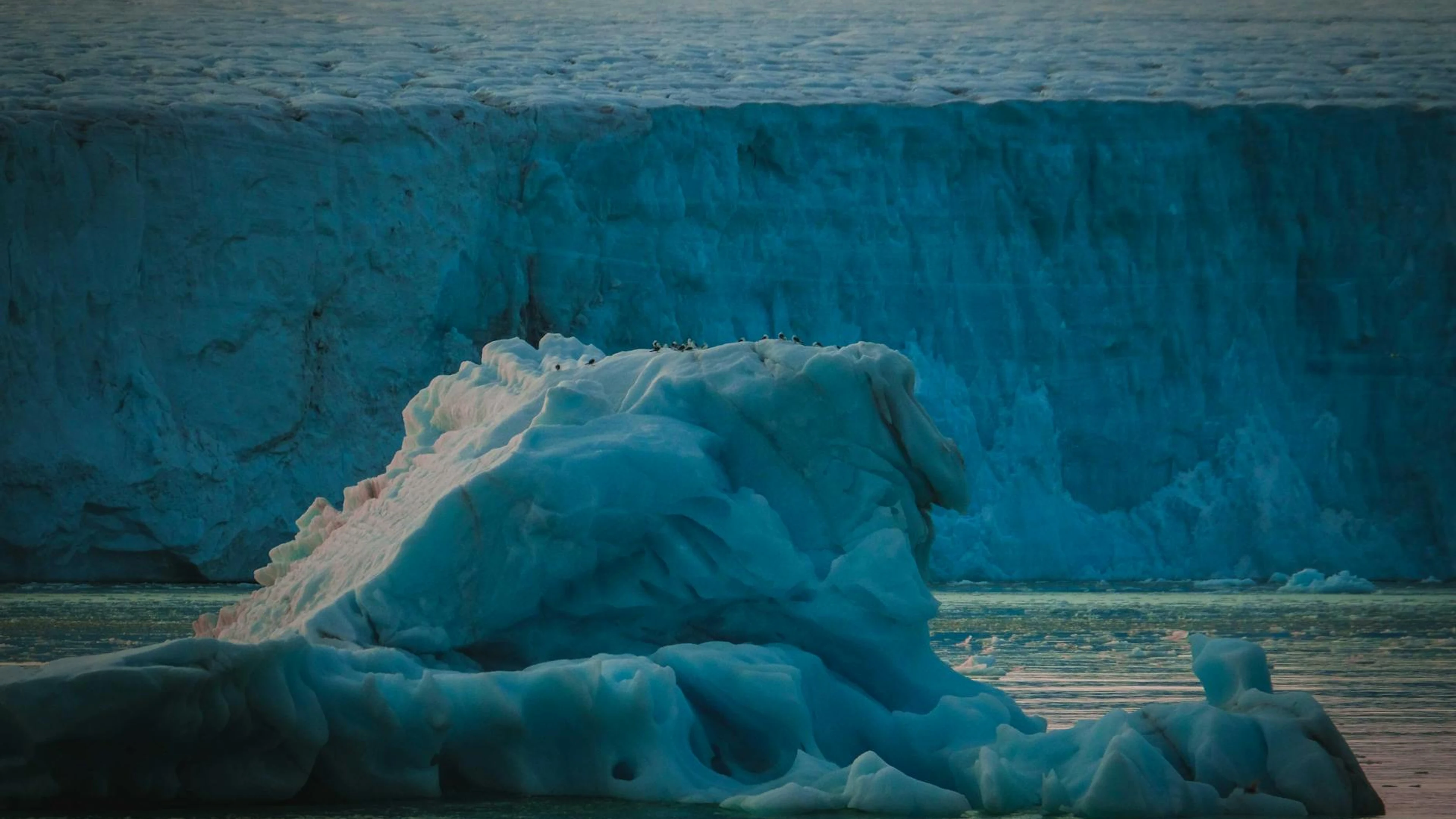 Dramatic view of an iceberg in the Arctic sea against a vast glacier during twil