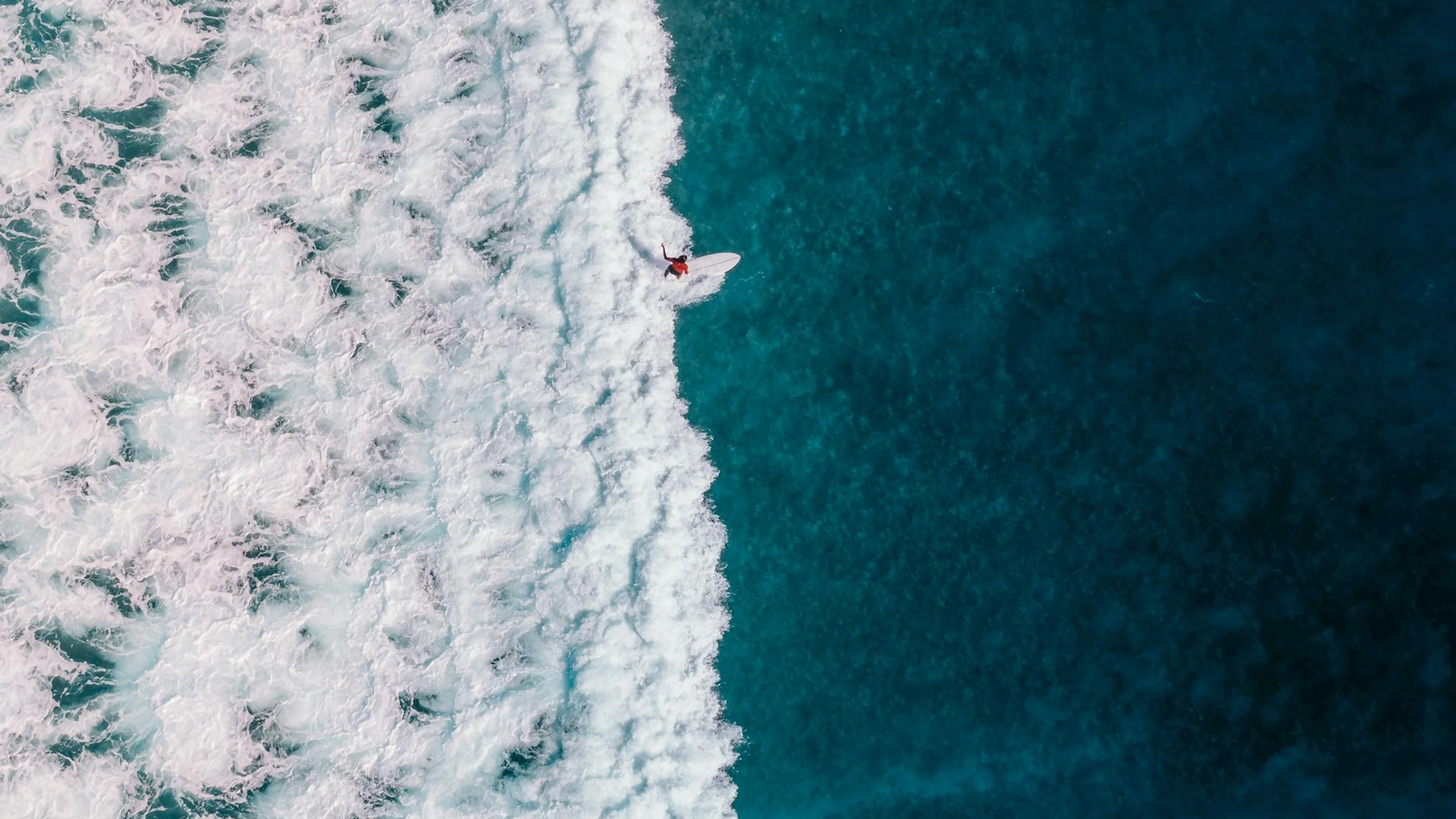 Free Drone shot capturing a surfer navigating the ocean's waves, showcasing the thril wallpaper in 4K Ultra HD resolution (3840x2160). Beautiful ocean background for your screen. No signup required.