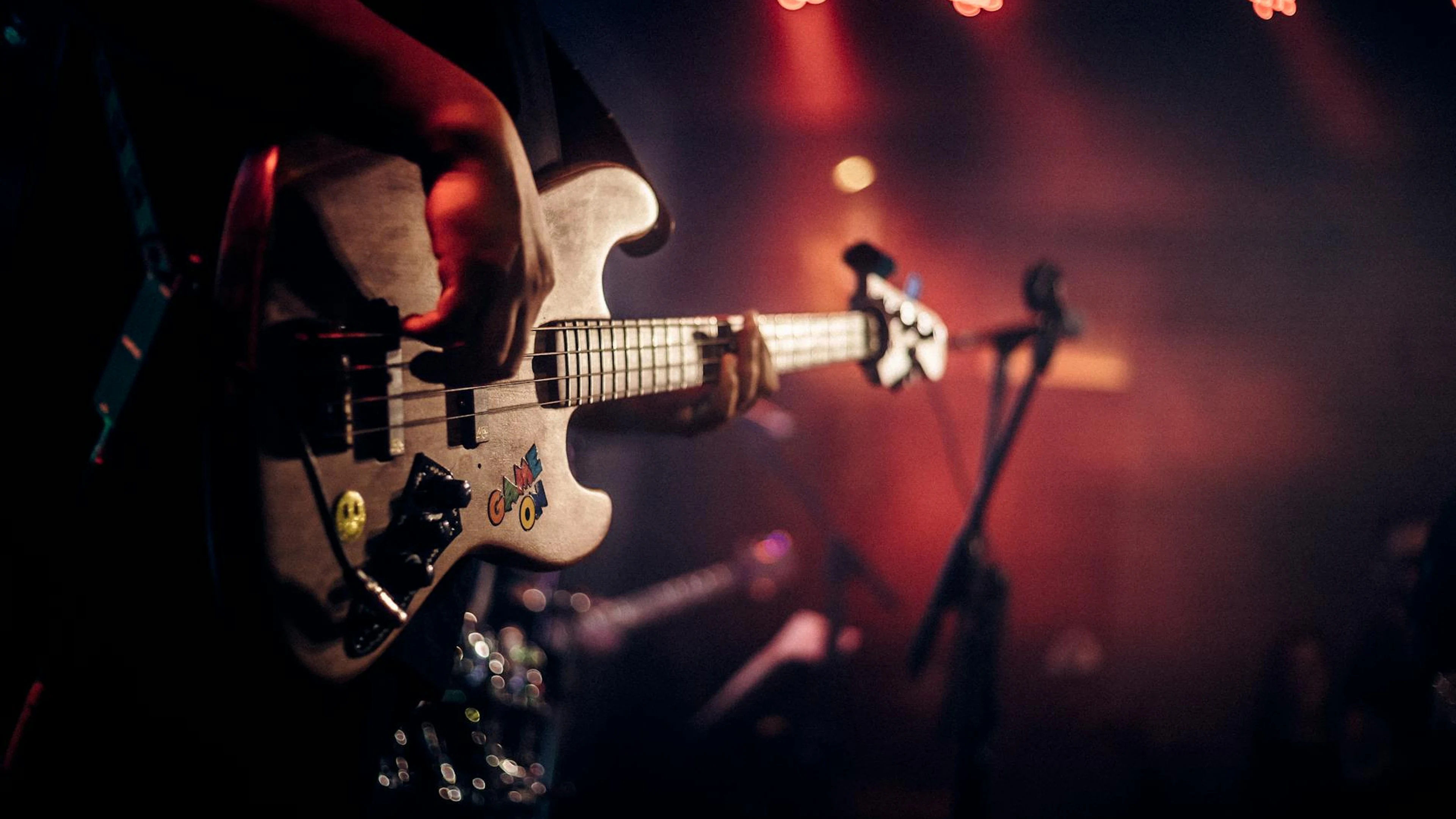 Download Dynamic image of a guitarist playing at a live music concert, illuminated by col wallpaper for free. 3840x2160 4K Ultra HD resolution, perfect for your desktop. High quality music wallpaper.