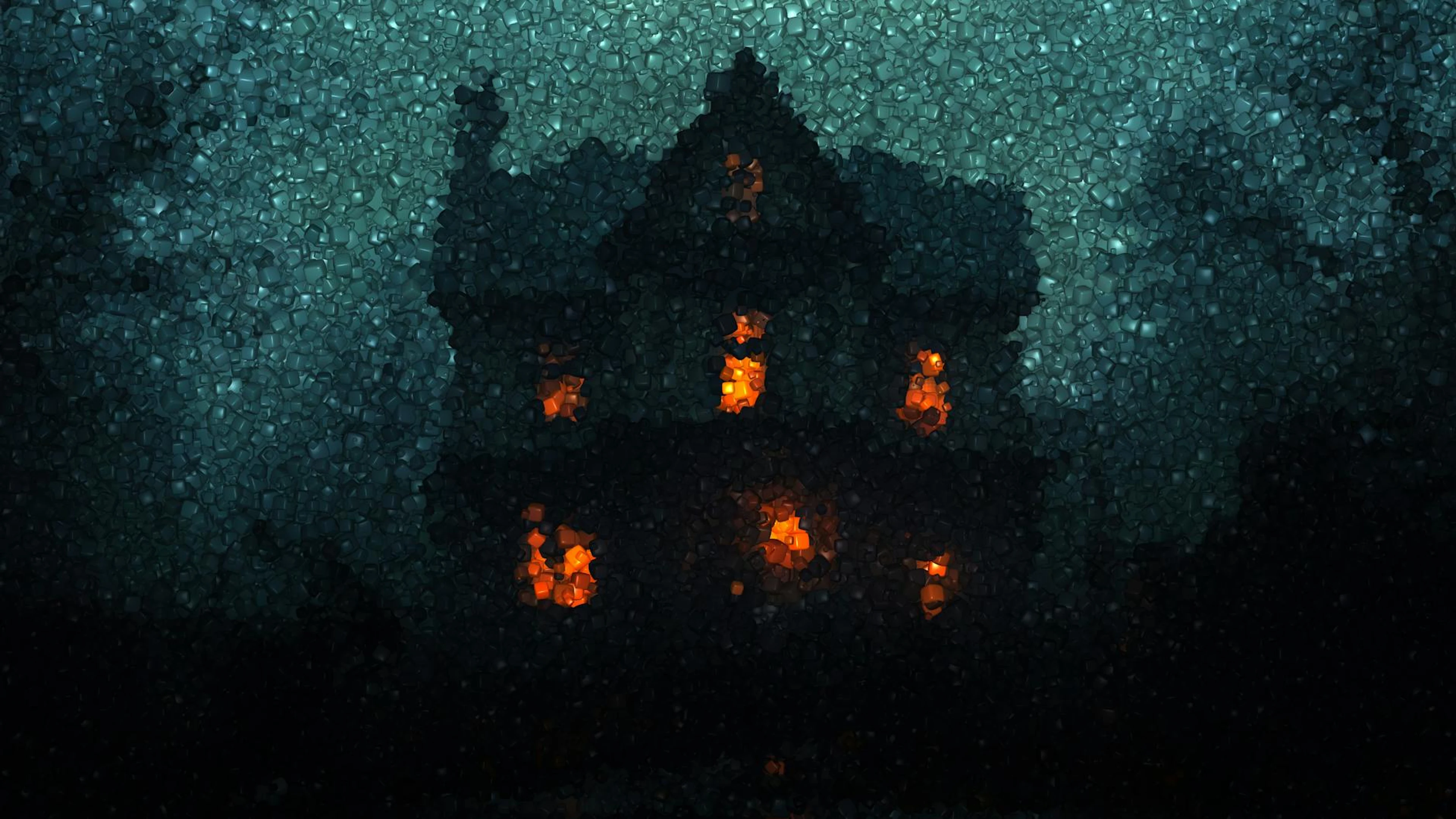 Get this stunning Eerie mosaic of a haunted house illuminated in the night, exuding a spooky atmos wallpaper in 4K Ultra HD quality. 3840x2160 dark wallpaper available for free download.