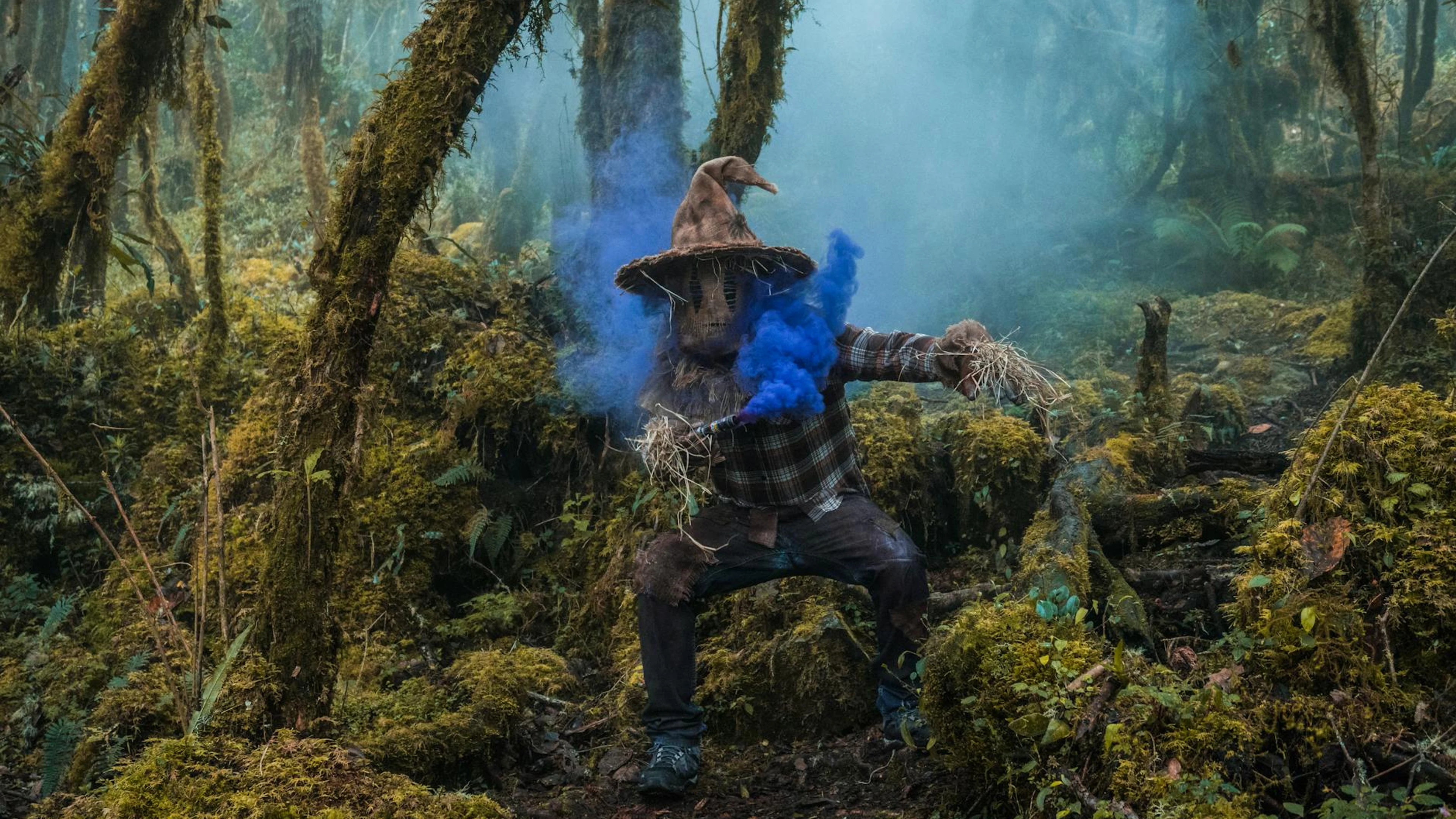 Free Eerie scarecrow with blue smoke in a dense Colombian forest evokes Halloween atm wallpaper in 4K Ultra HD resolution (3840x2160). Beautiful fantasy background for your screen. No signup required.