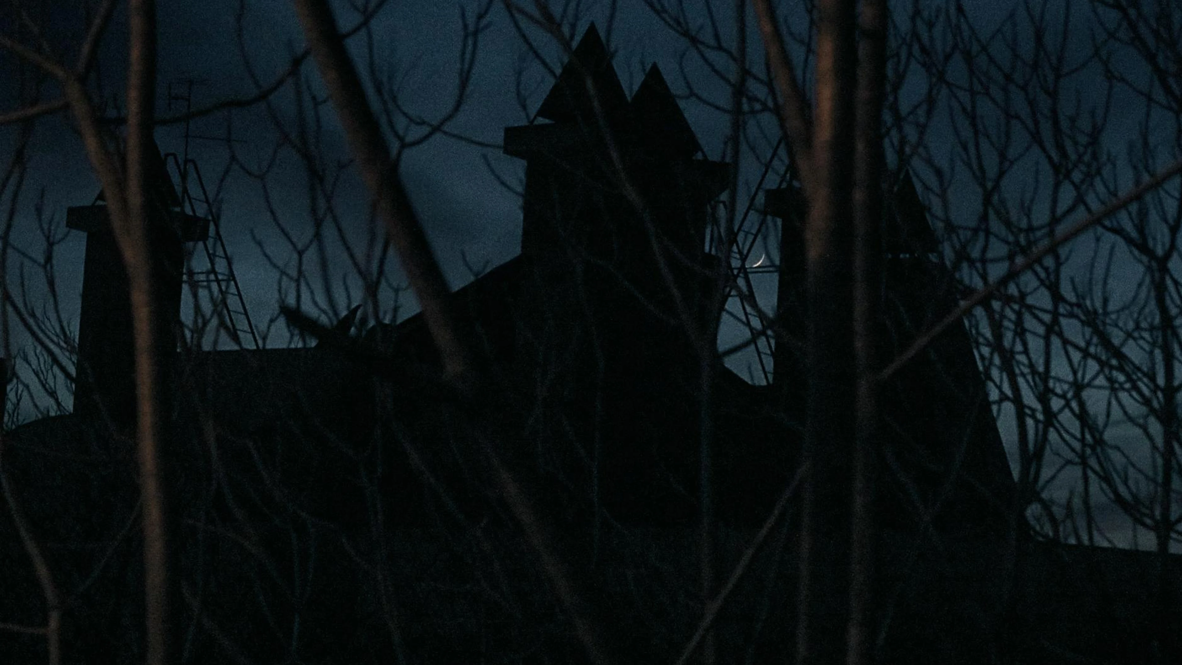 Get this stunning Eerie shadow of an old house seen through leafless trees under a crescent moon n wallpaper in 4K Ultra HD quality. 3840x2160 dark wallpaper available for free download.