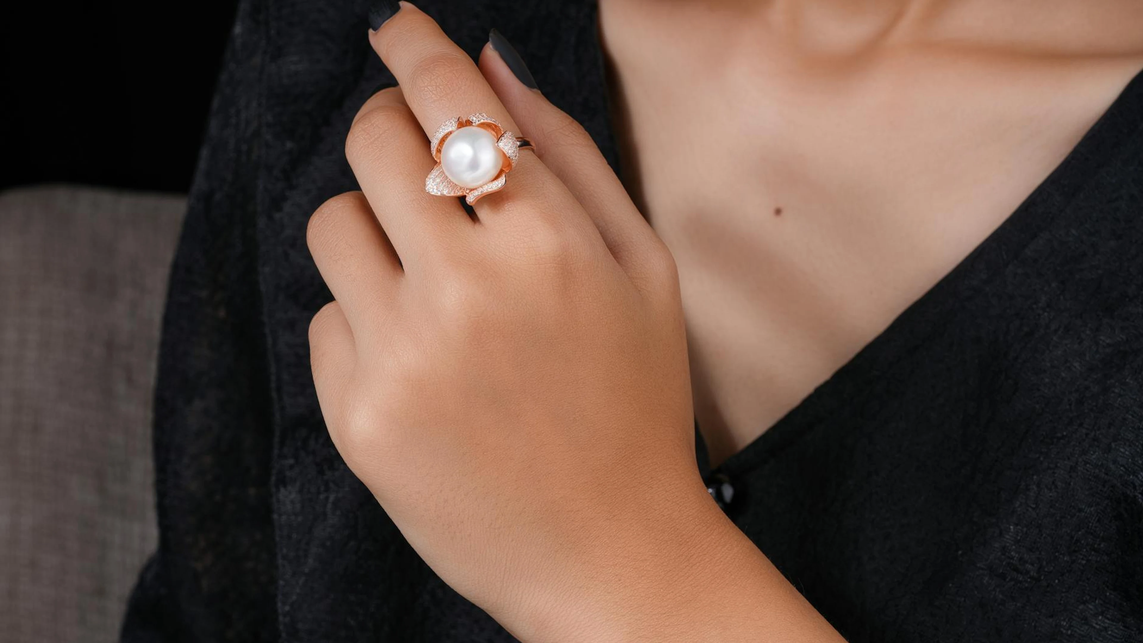 Elegant close-up of a woman's hand adorned with a pearl ring, perfect for jewelr