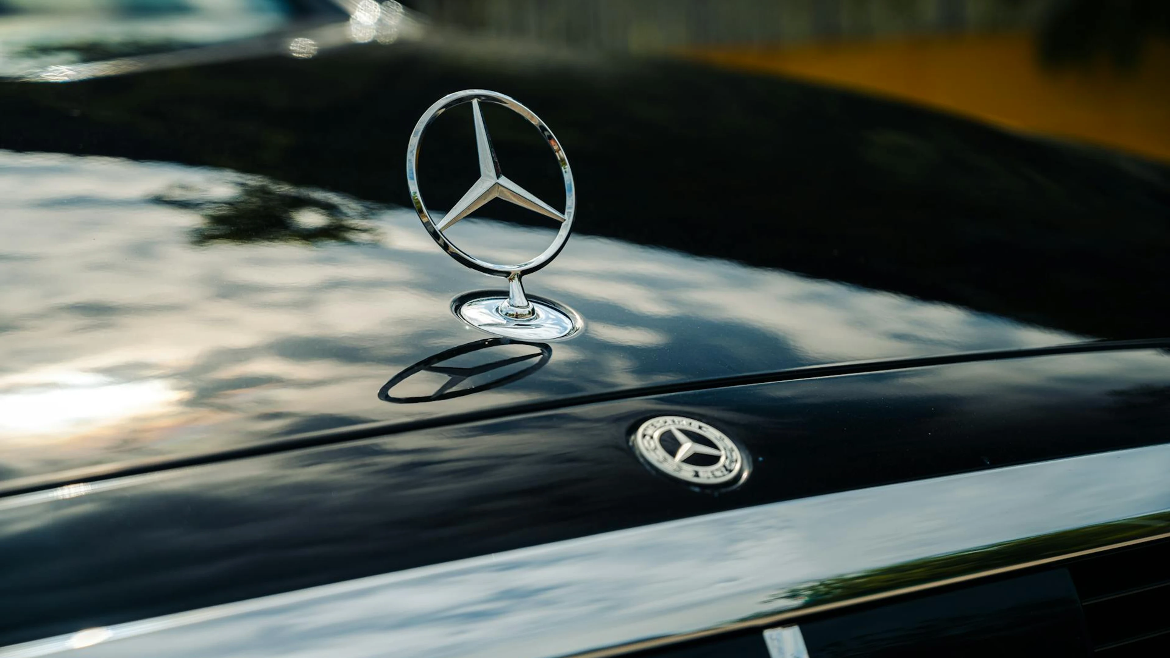 Elegant reflection of a luxury car emblem on a sleek black hood captures high-en - free 4K Ultra HD cars wallpaper for desktop