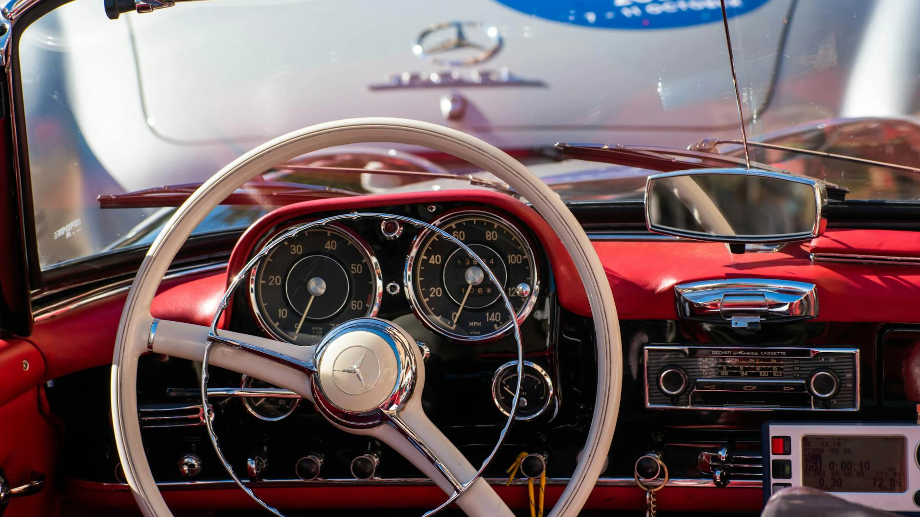 Elegant vintage Mercedes-Benz interior showcasing a classic dashboard and steeri