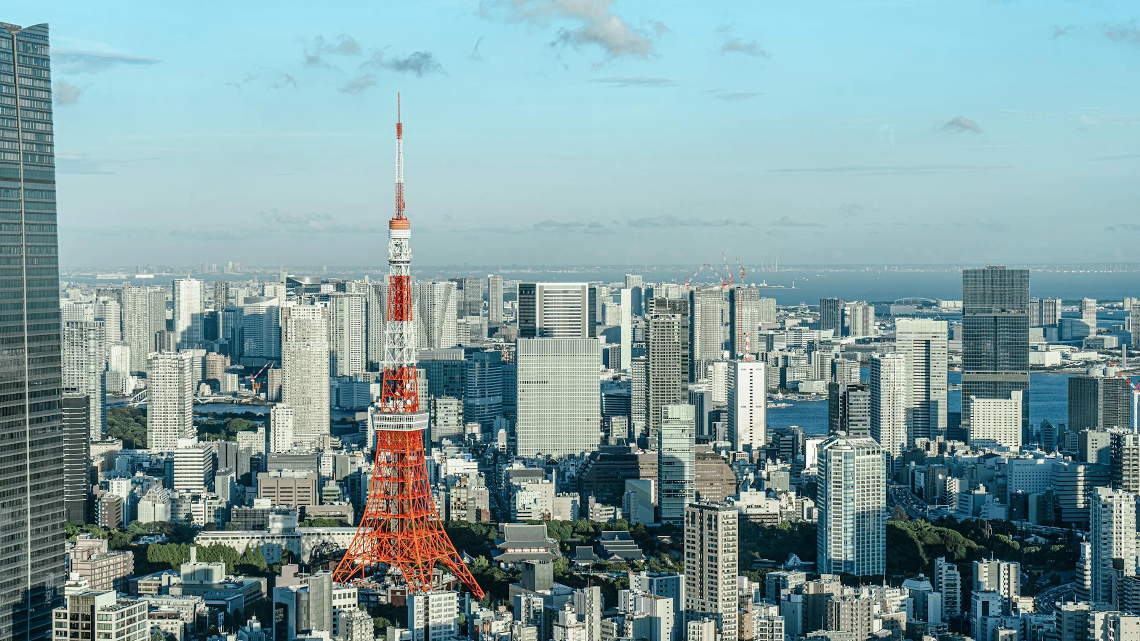 Elevated view of Tokyo cityscape with the iconic Tokyo Tower under a clear blue  - free 4K Ultra HD city wallpaper for desktop