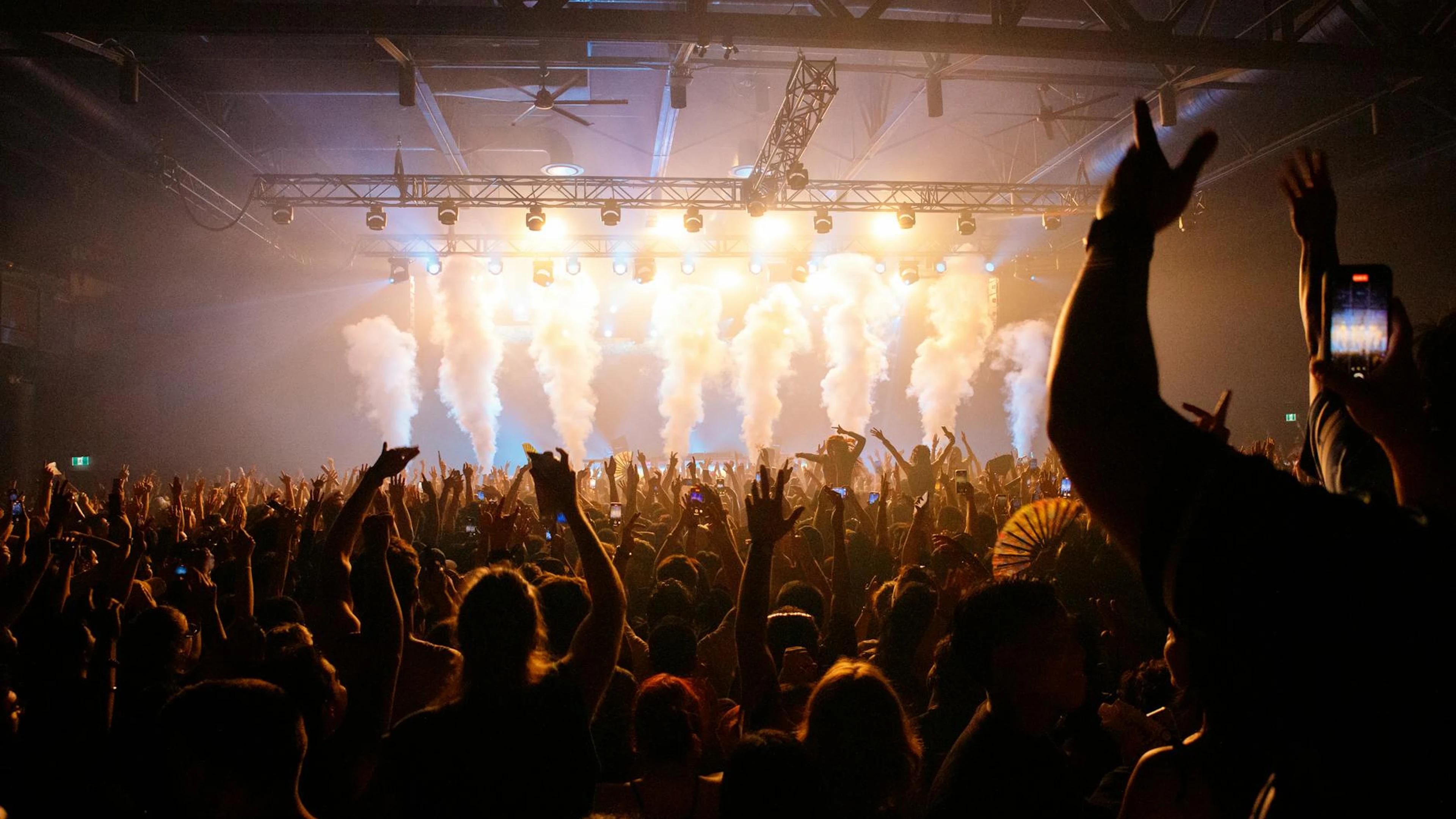 Energetic crowd enjoying a concert with dynamic lighting and smoke effects in an