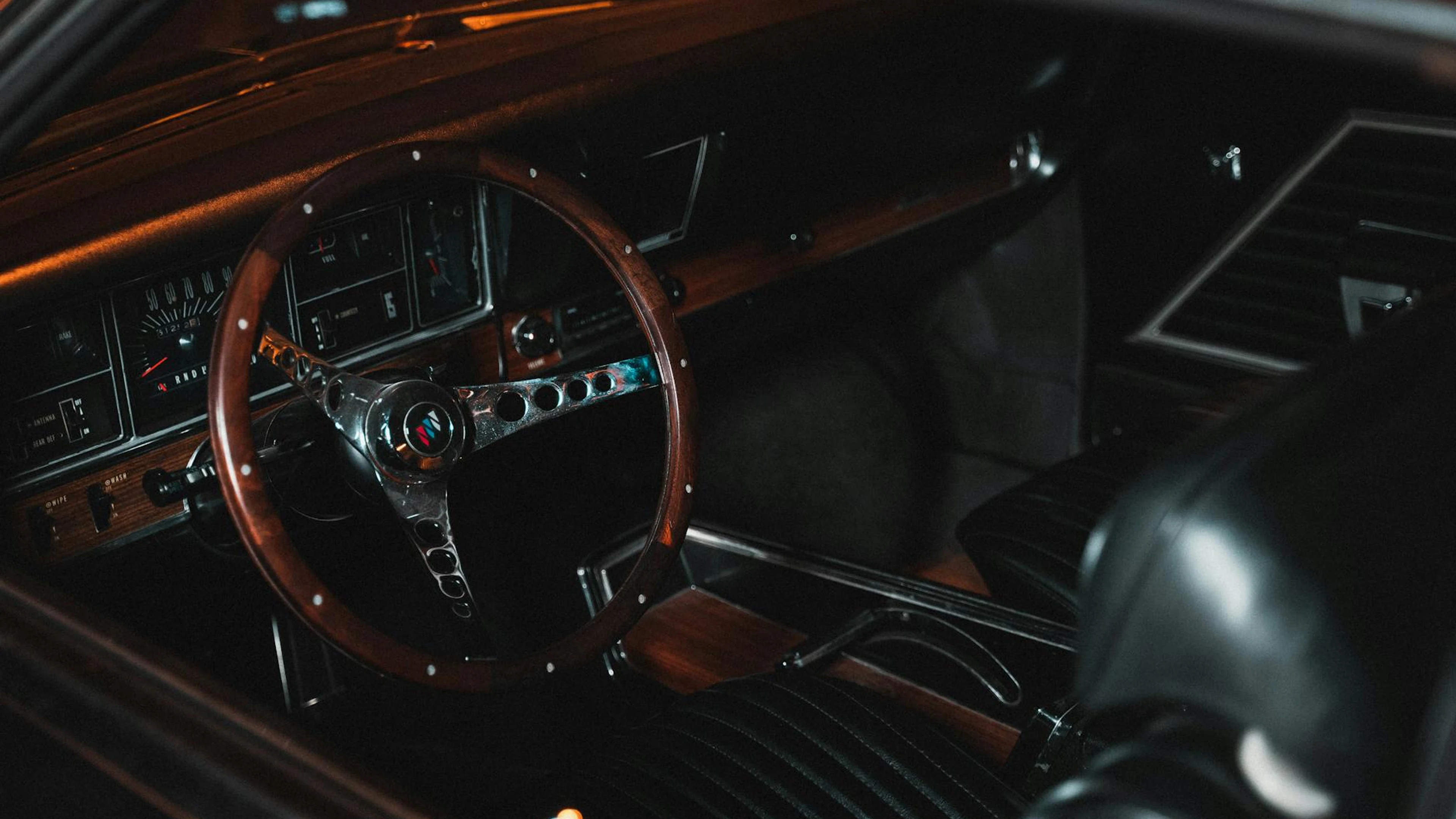 Download Explore the elegant interior of a classic car featuring a wooden steering wheel wallpaper for free. 3840x2160 4K Ultra HD resolution, perfect for your desktop. High quality aesthetic wallpaper.