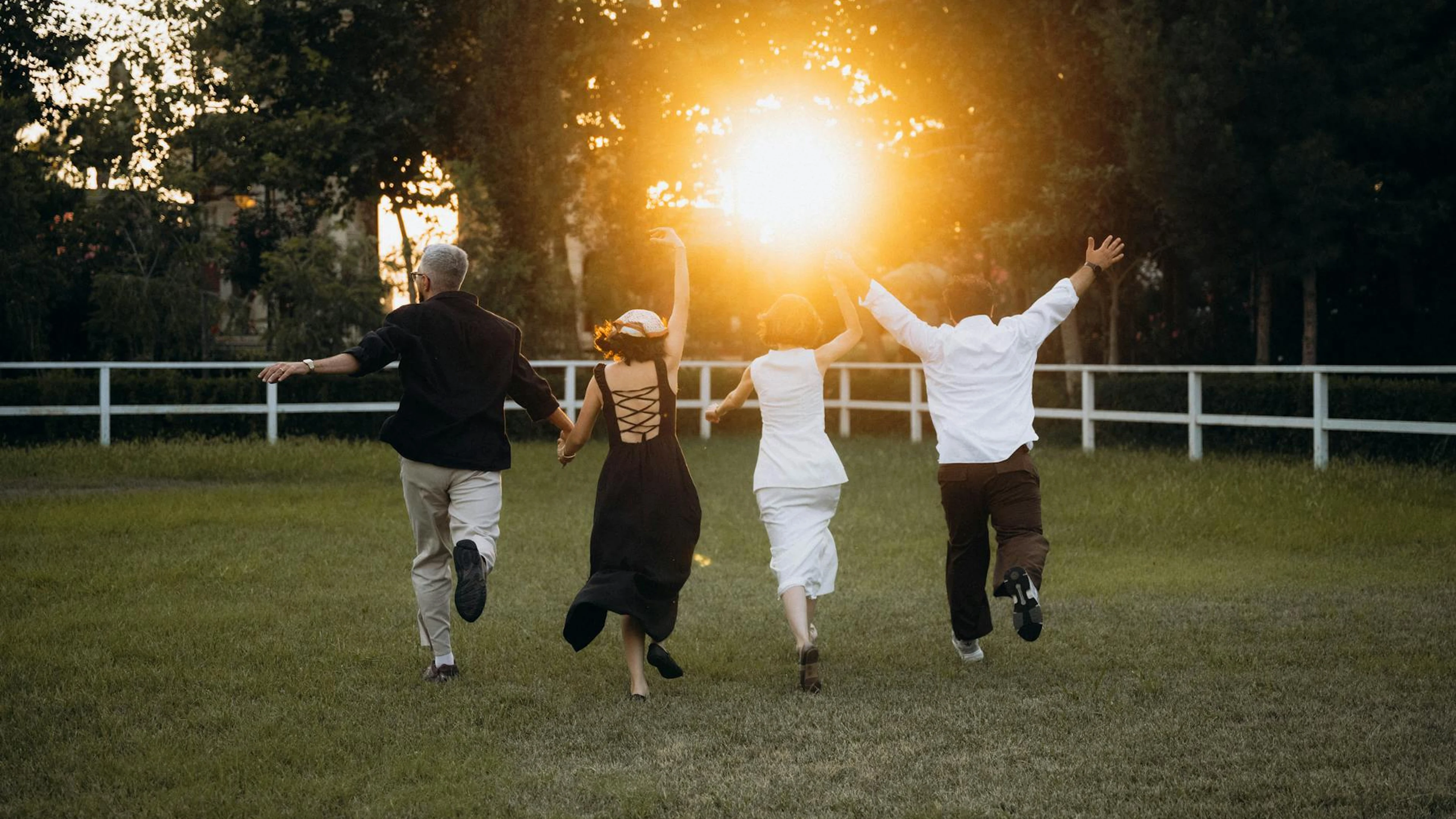 Four adults joyfully running towards the sunset in a green field, capturing a li