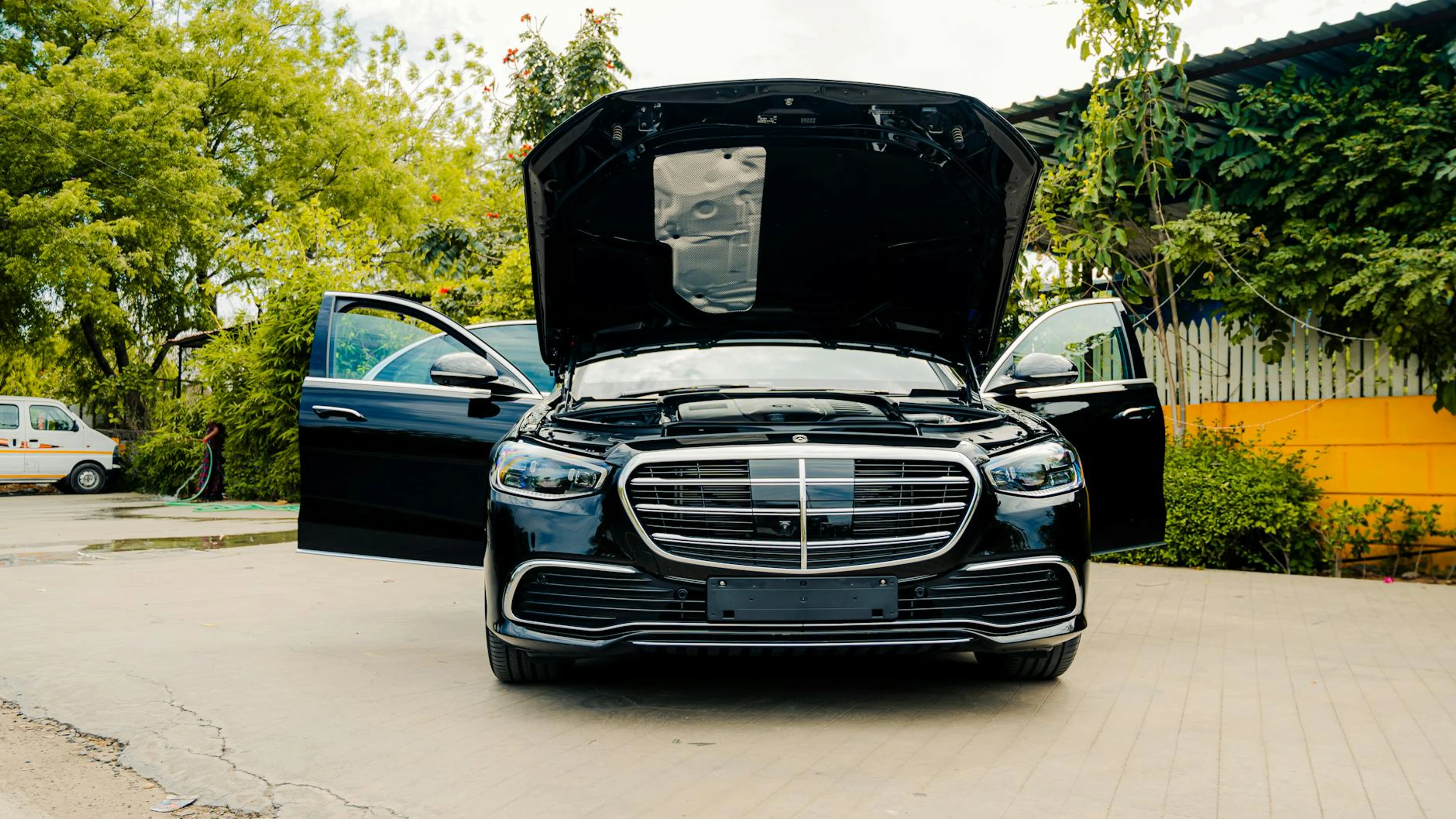 Download Front view of a luxury black Mercedes-Benz with hood and doors open, outdoors. wallpaper for free. 3840x2160 4K Ultra HD resolution, perfect for your desktop. High quality cars wallpaper.