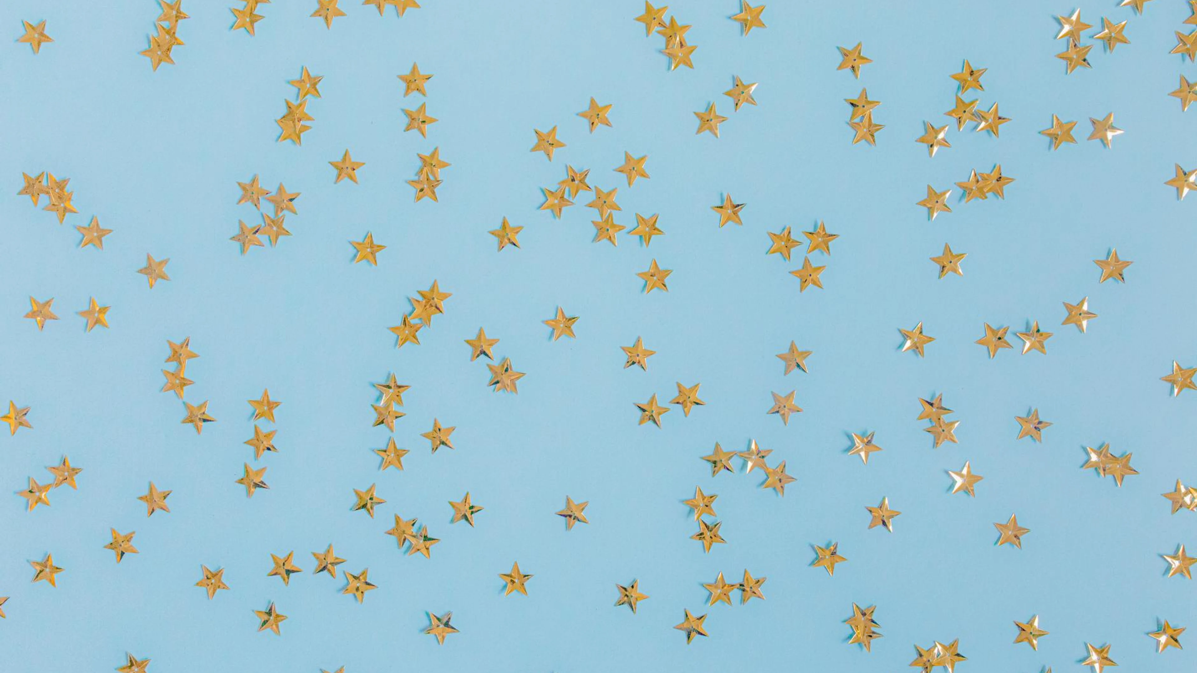 Get this stunning Gold star confetti scattered over a light blue surface, perfect for festive occa wallpaper in 4K Ultra HD quality. 3840x2160 minimal wallpaper available for free download.