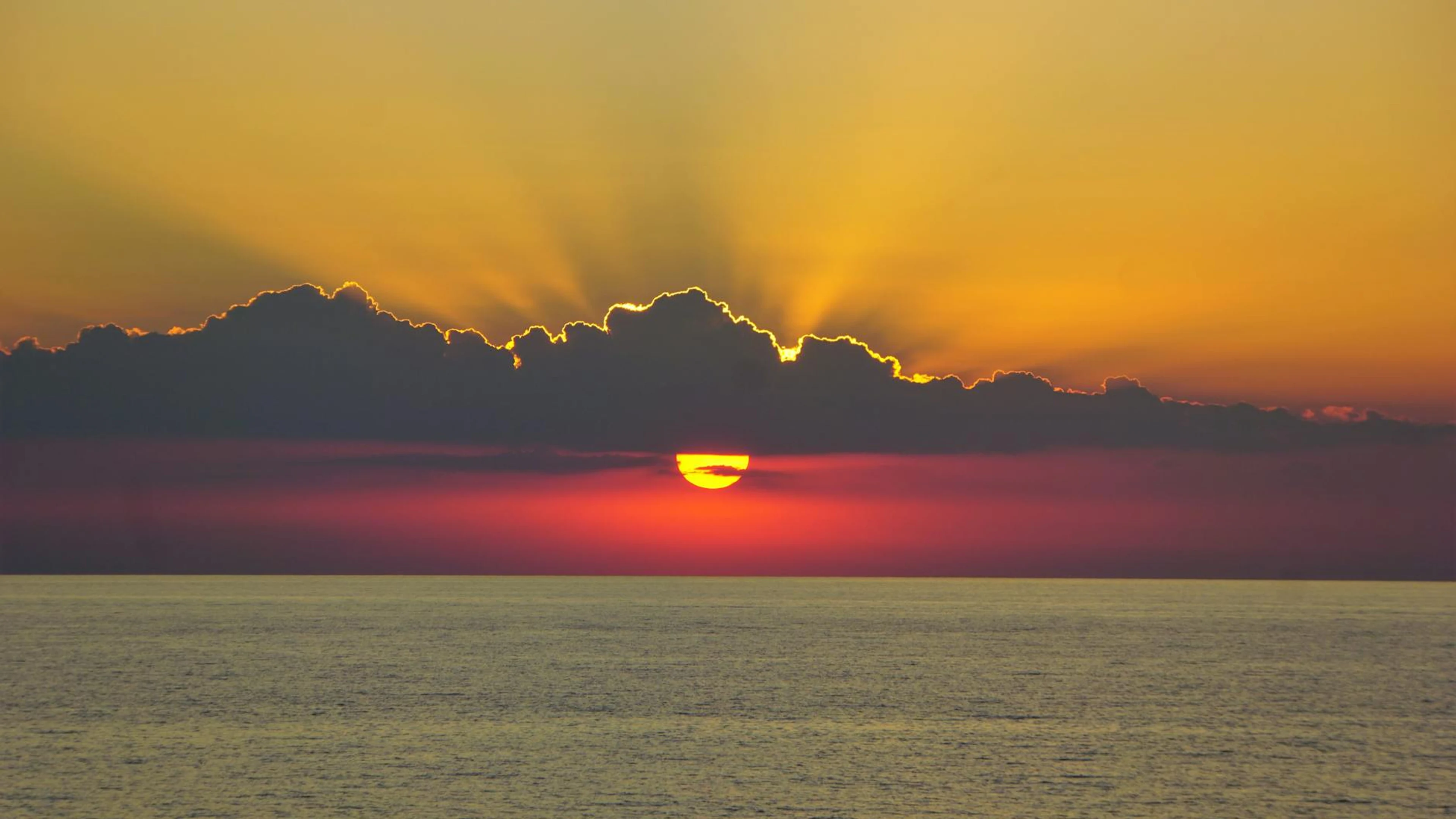 Free Golden sunset with dramatic clouds over a serene ocean horizon. wallpaper in 4K Ultra HD resolution (3840x2160). Beautiful sunset background for your screen. No signup required.