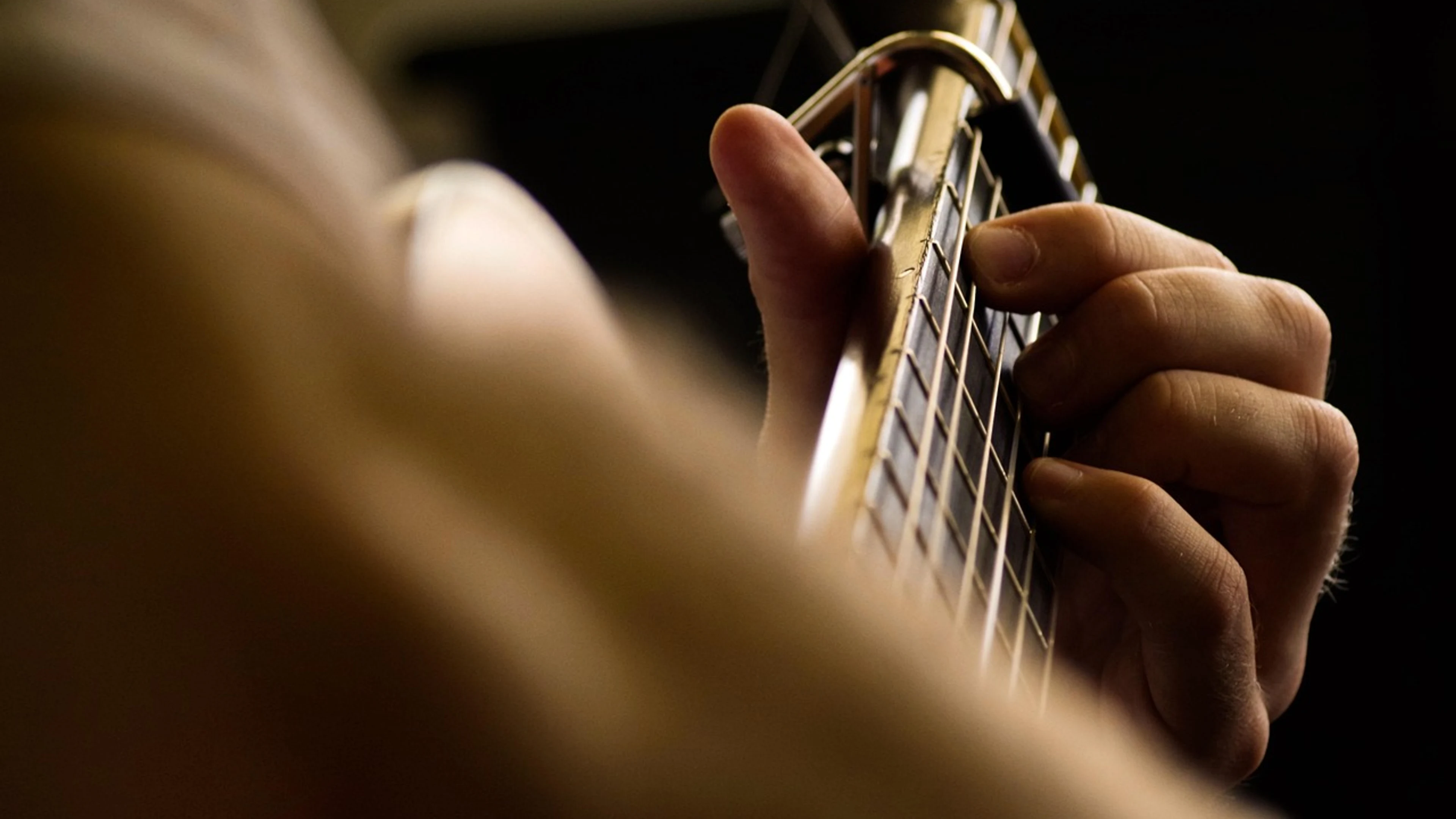 A person strumming chords on an acoustic guitar, focusing on fretboard technique