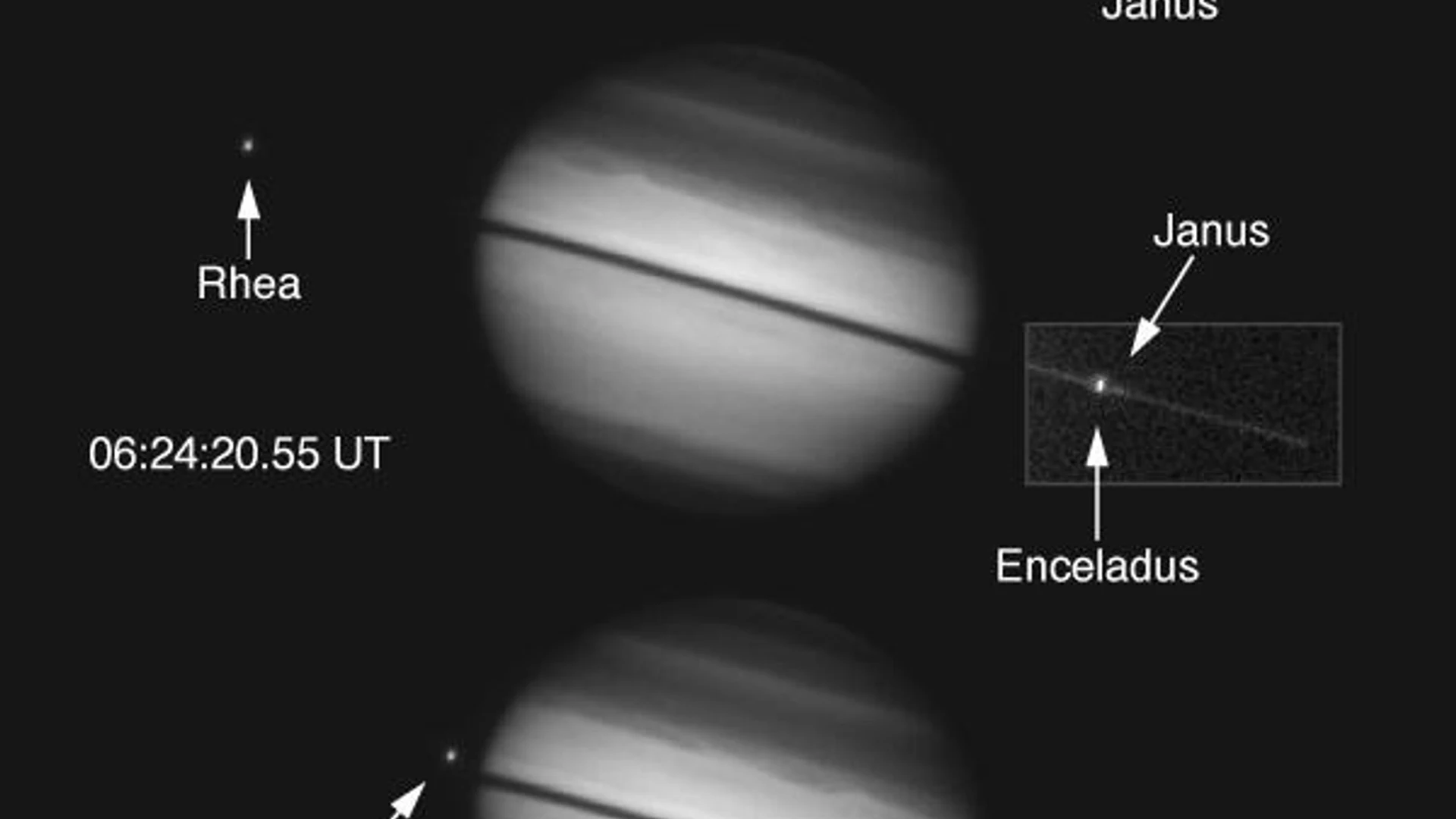 Hubble Views Saturn Ring-Plane Crossing Satellites Labeled