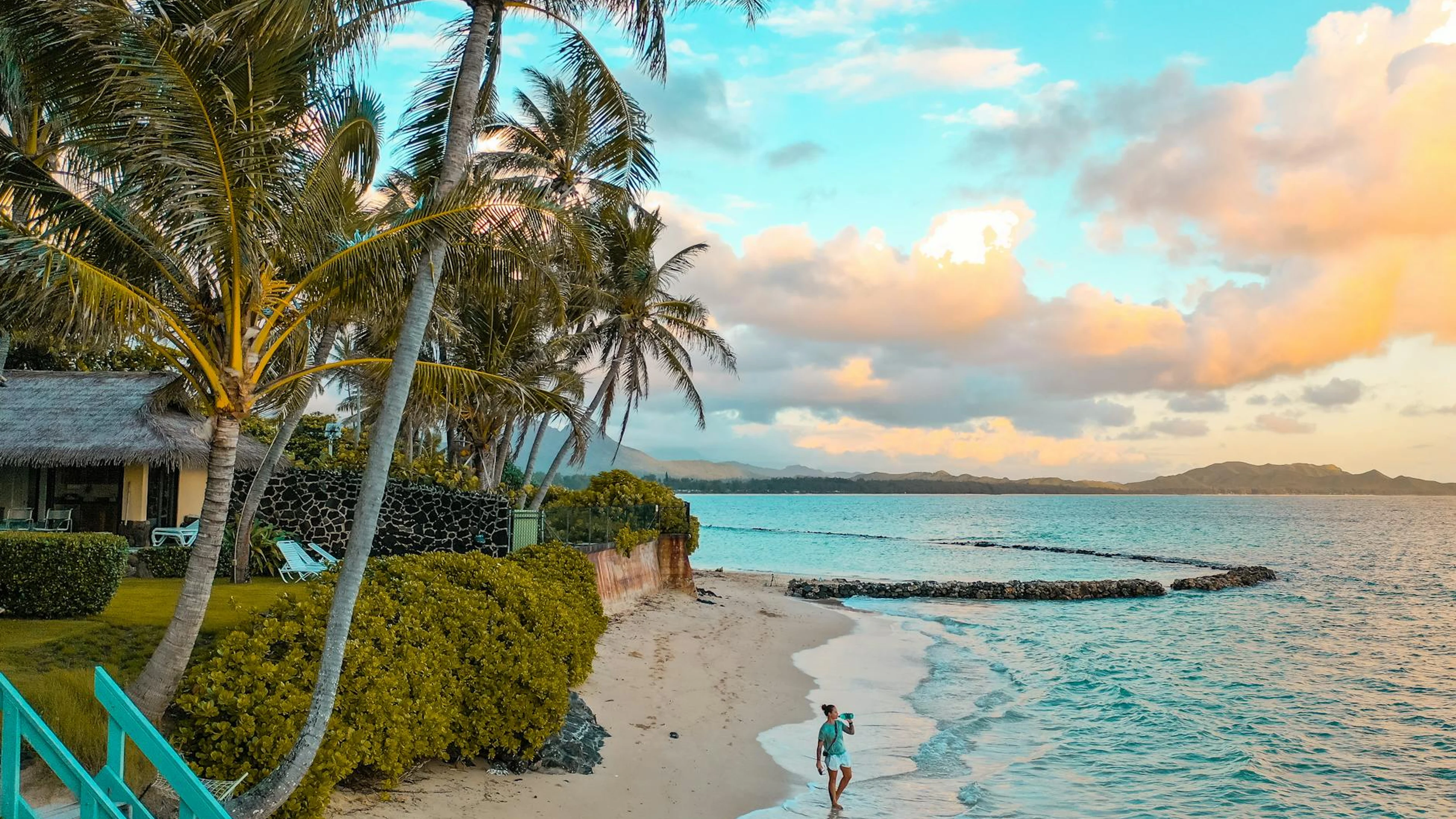Get this stunning Idyllic tropical beach with palm trees and vibrant sunset. Perfect for a relaxin wallpaper in 4K Ultra HD quality. 3840x2160 ocean wallpaper available for free download.