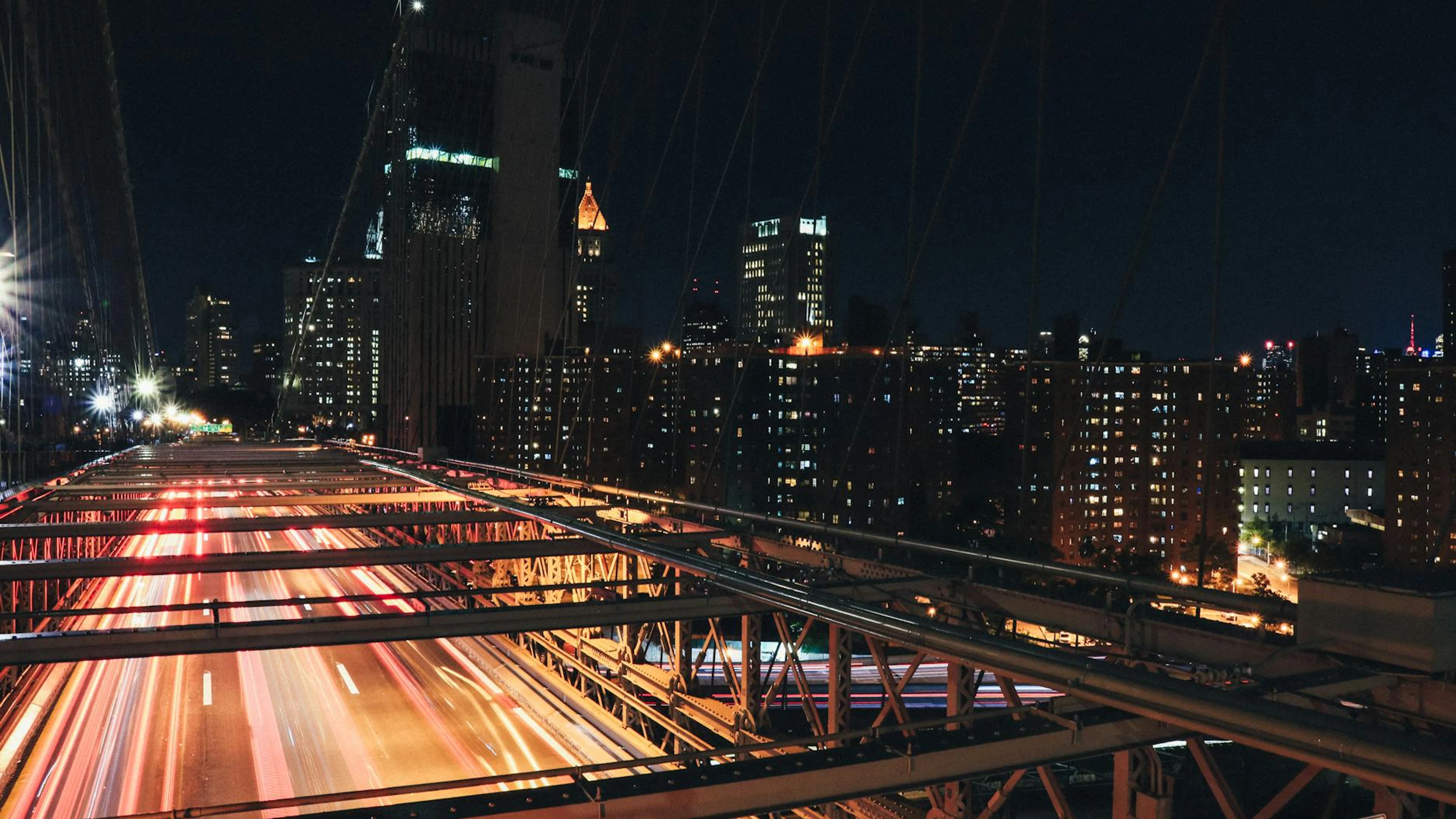 Long exposure shot capturing traffic on Brooklyn Bridge, NYC, at night with illu - free 4K Ultra HD city wallpaper for desktop