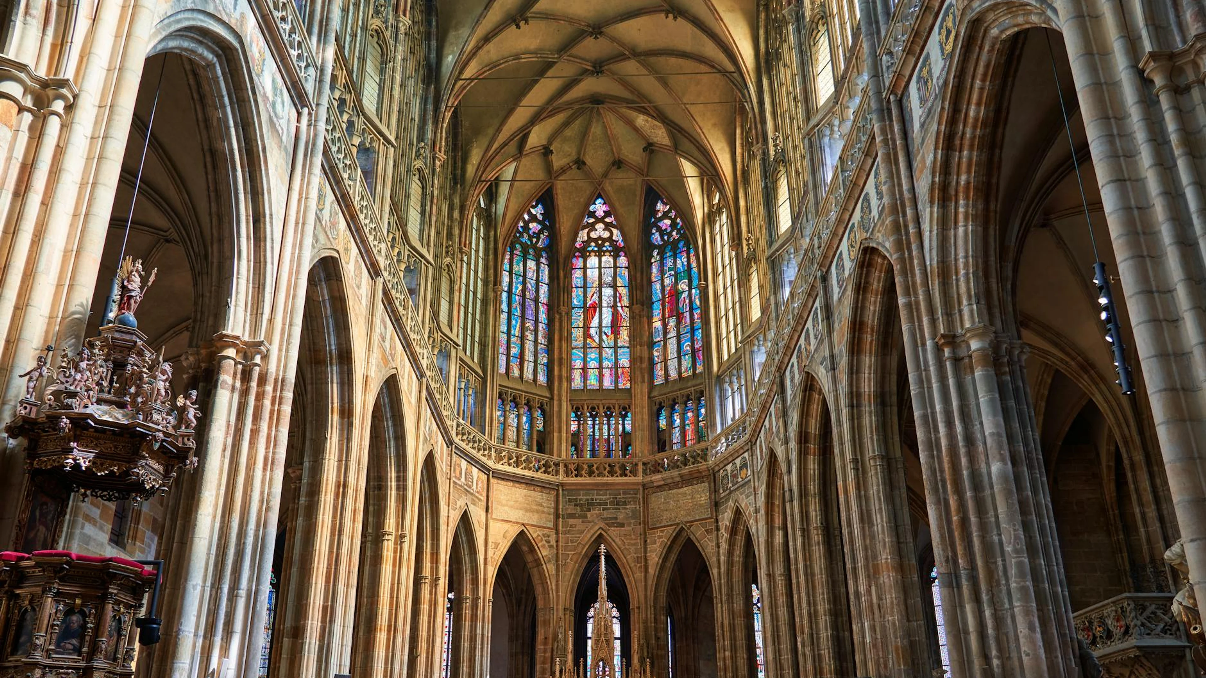 Low angle view of the intricate interior and stained glass of St. Vitus Cathedra