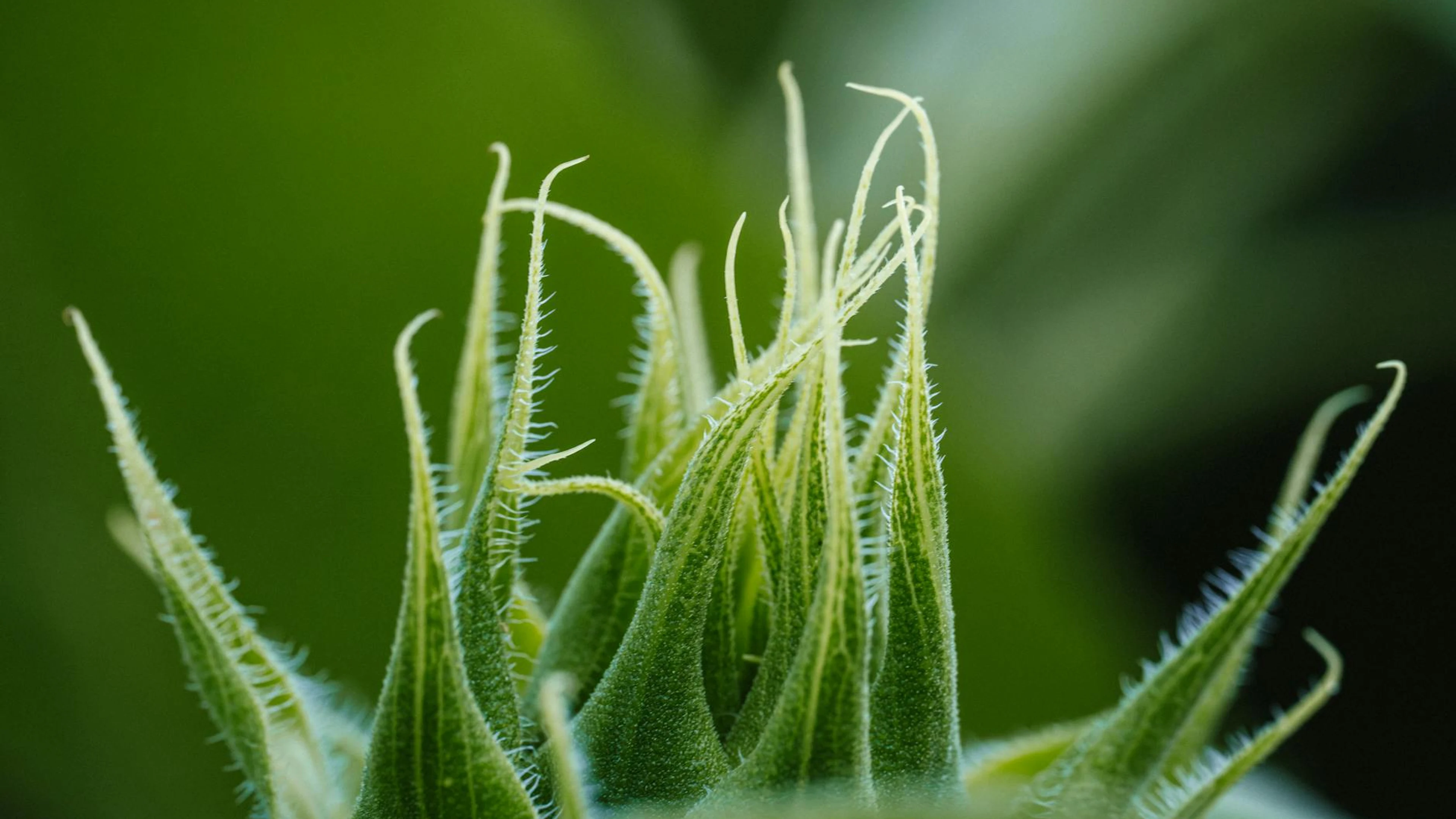 Macro shot capturing the intricate details of a fuzzy green plant bud with vibra