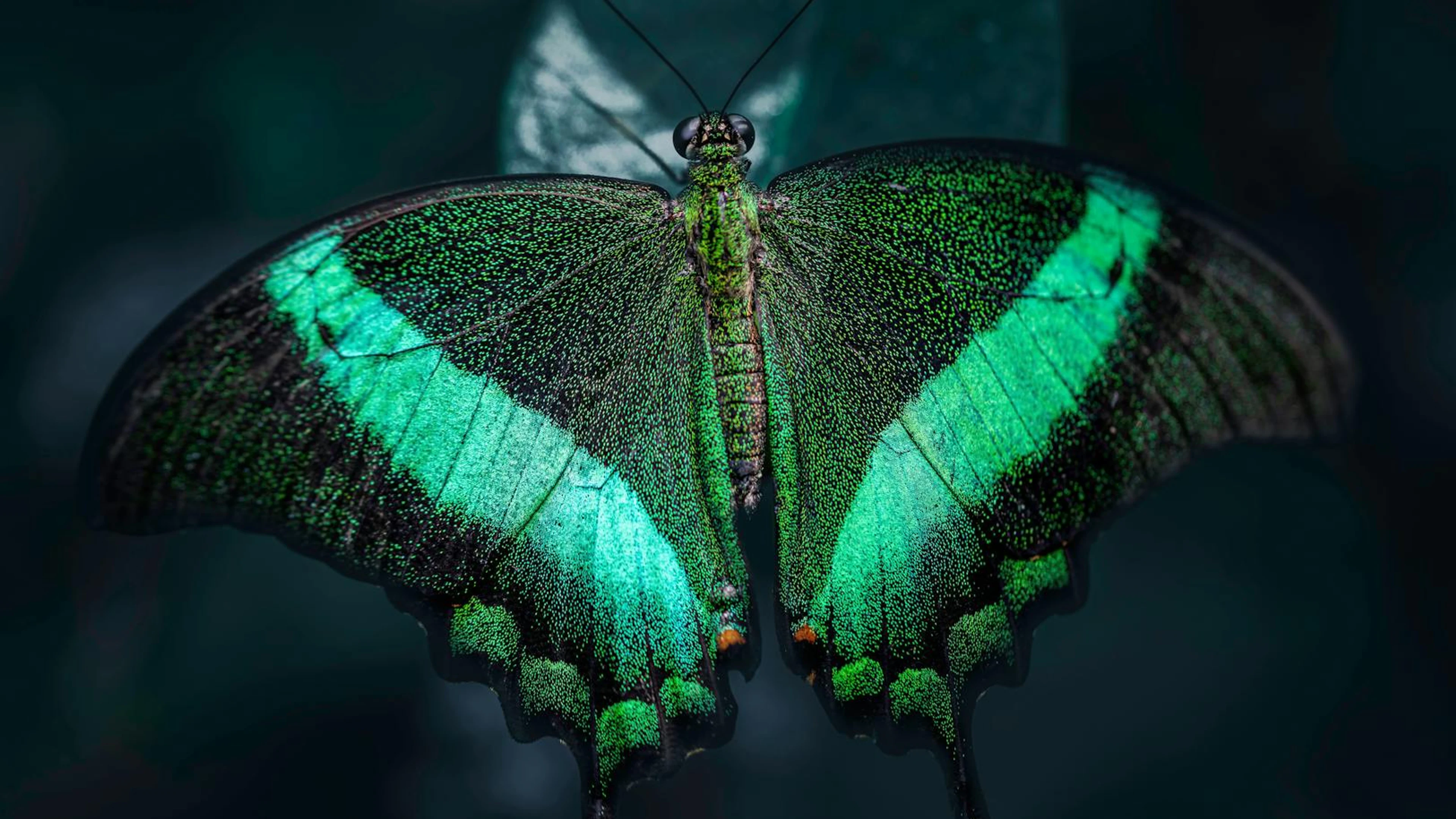 Download Macro view of Common banded peacock butterfly with green stripes on black wings wallpaper for free. 3840x2160 4K Ultra HD resolution, perfect for your desktop. High quality macro wallpaper.