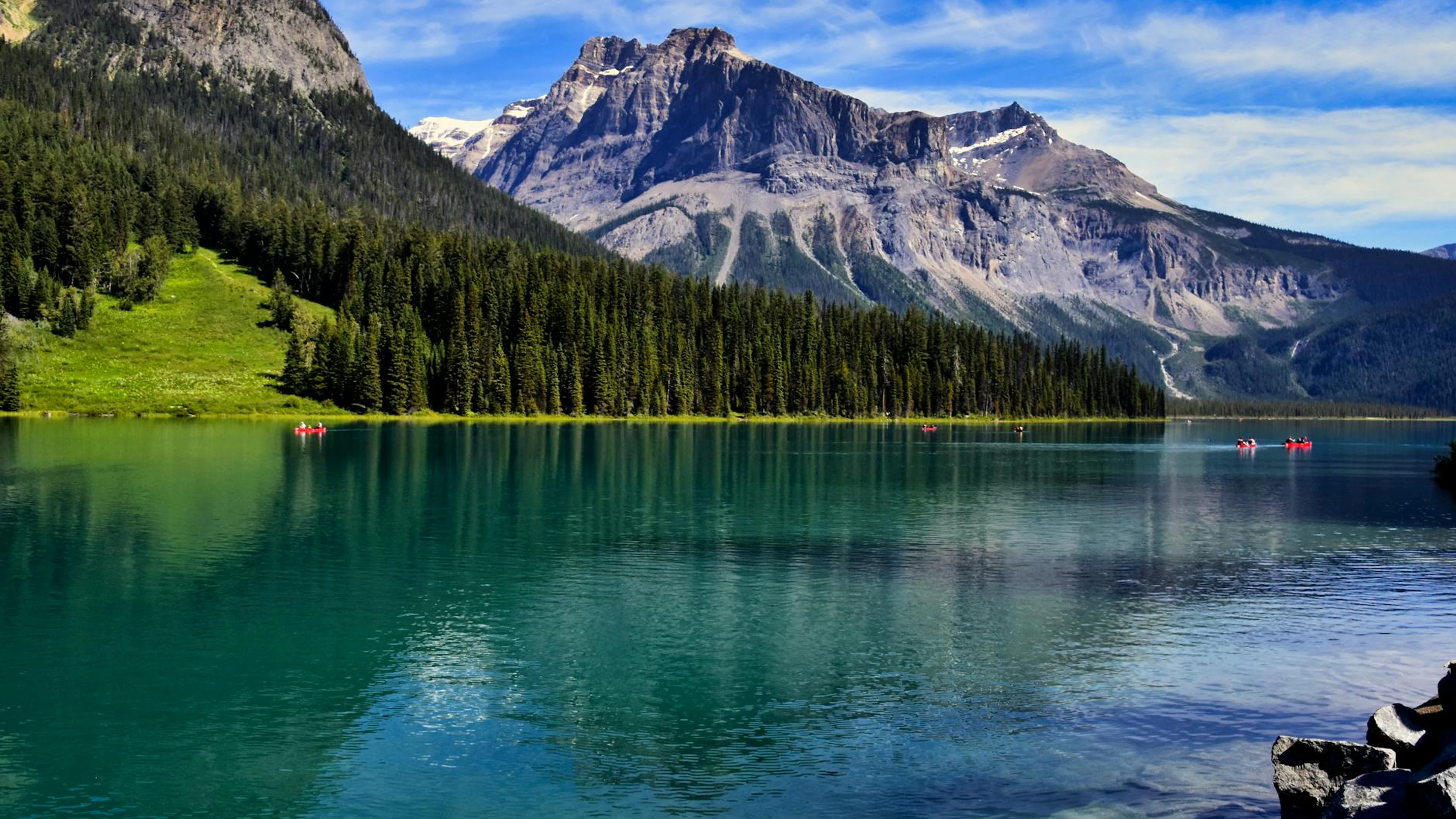 Free Majestic view of Emerald Lake with reflections and towering mountains in BC, Can wallpaper in 4K Ultra HD resolution (3840x2160). Beautiful lake background for your screen. No signup required.